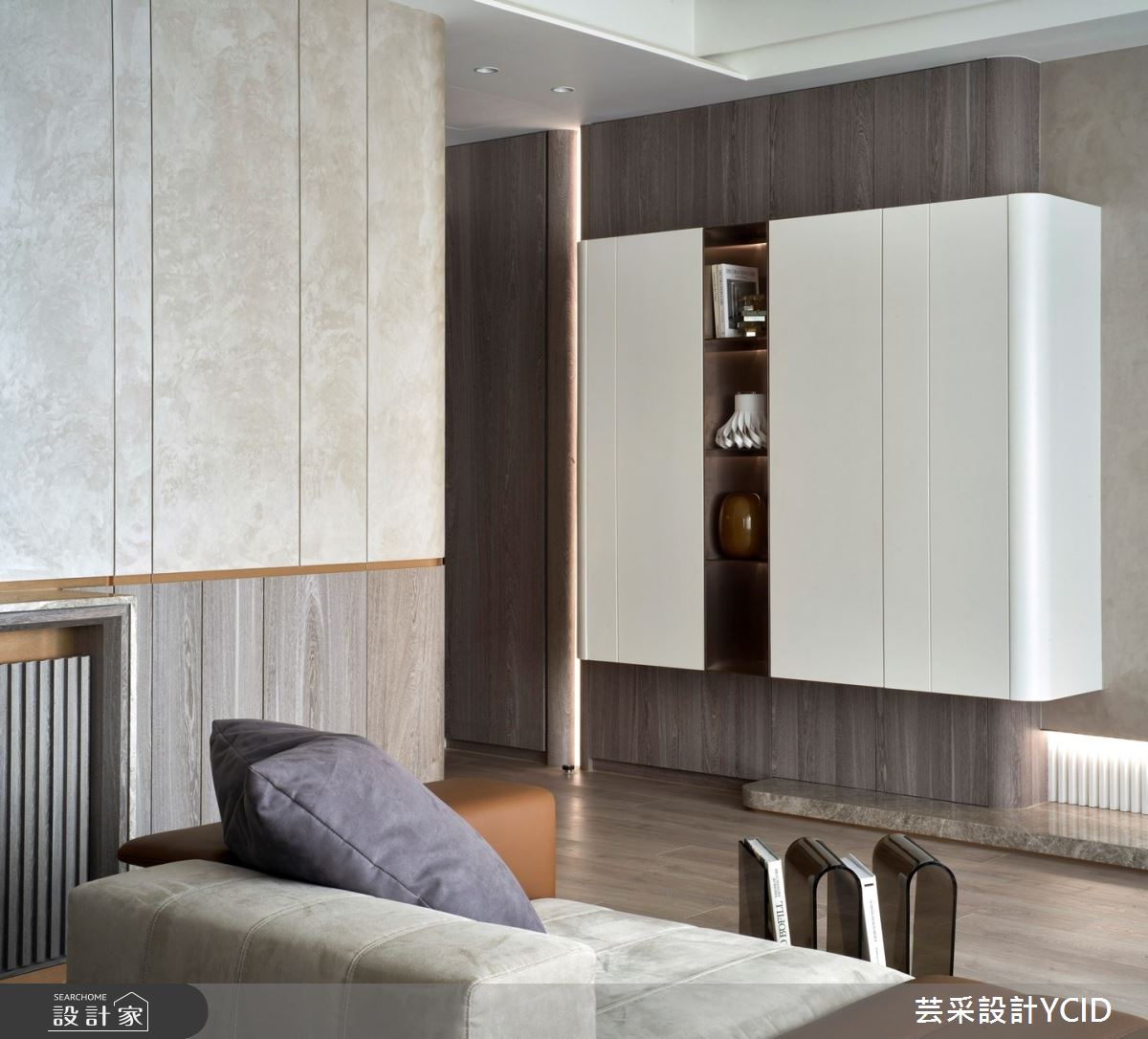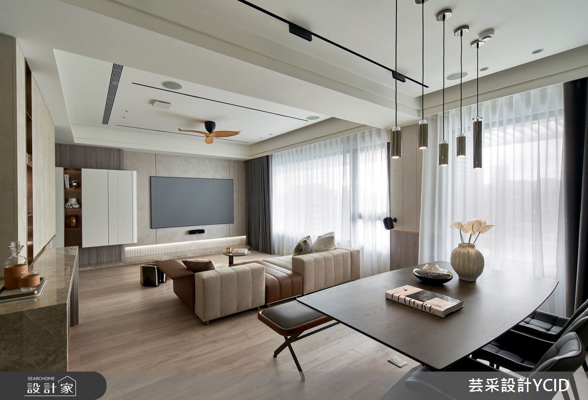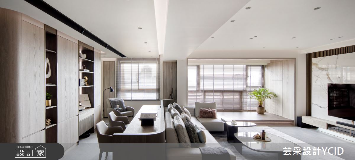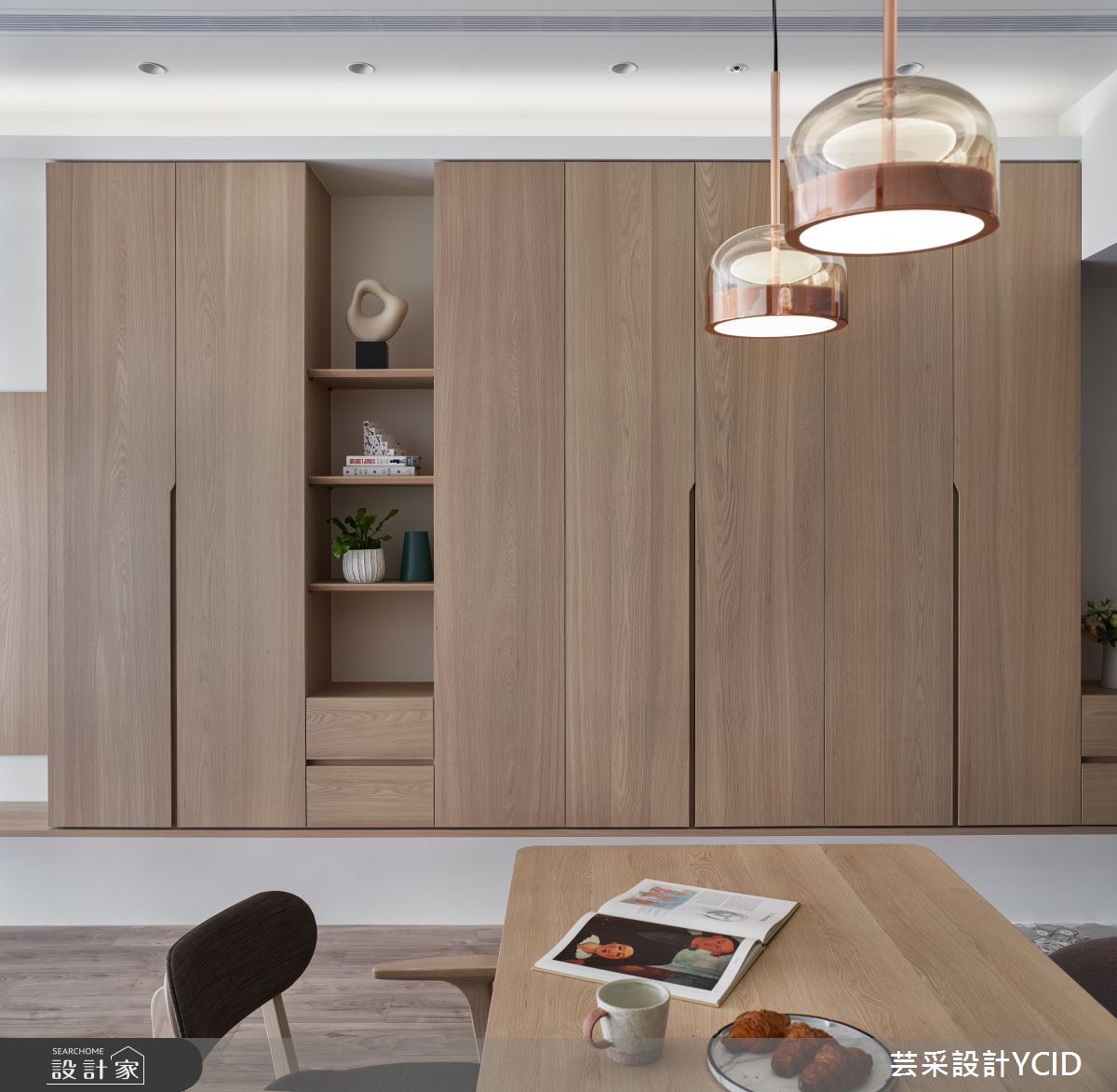 芸采設計以壁紙、水泥漆、超耐磨木地板、鐵件、灰鏡、茶玻、鍍鈦金屬、木作貼皮、系統板材、大理石、木百葉、皮革、噴漆、實木的搭配應用,呈現混搭風居家氛圍,將此間50坪、三房、單層、新成屋(5年以下)打造成舒適愜意的家庭空間,完成2位大人、2位小孩全家人的夢想之居。