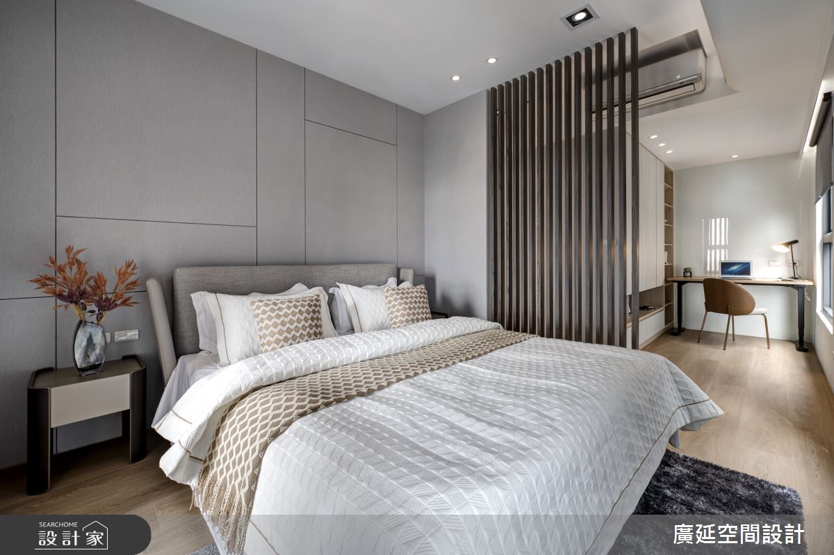 28 坪現代風居宅,設計師運用天然建材的細緻鋪陳、自然光源引入與燈光配置,調和細膩又時尚的氛圍,營造出品味十足的精品空間,快跟著小編一起來看看吧! 玄關區域鋪陳整面收納櫃,一路延伸到客廳主牆,替玄關、客廳場域做出完美銜接;空間整體採以淺色作基底,添入木質語彙勾勒溫潤氣息,同時挹注開放式規劃、減少實牆隔閡,僅用量體及家具等界定使用主題範圍、梳理流暢的動線,形塑舒適美型的廳區視野;廚房則安排於餐廳門片後方,且考量使用需求,額外安排一座餐水櫃,用以收納物件與器具,構築宜居的生活機能;主臥床頭則藉由布面鋪陳,加以溝縫線條分割,展現細緻的立面表情,搭配著美好窗景與溫潤的建材運用,營造舒適質感! 小編的最愛 臥房內規畫大尺度的玻璃窗景,除了攬進美好日光,也把櫻花樹景色攬入室內,將窗面化為最迷人的構圖!