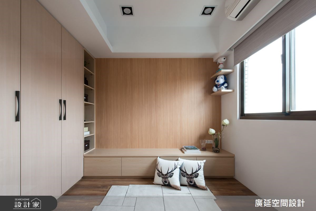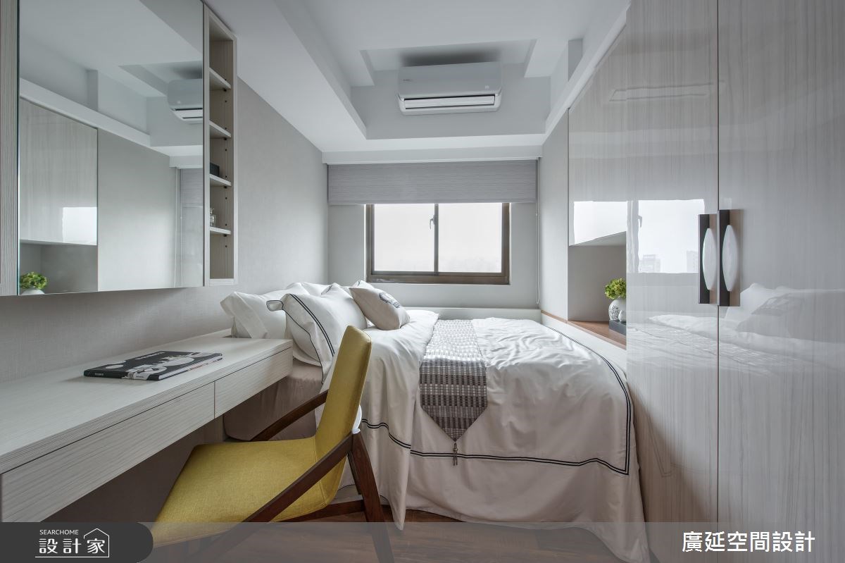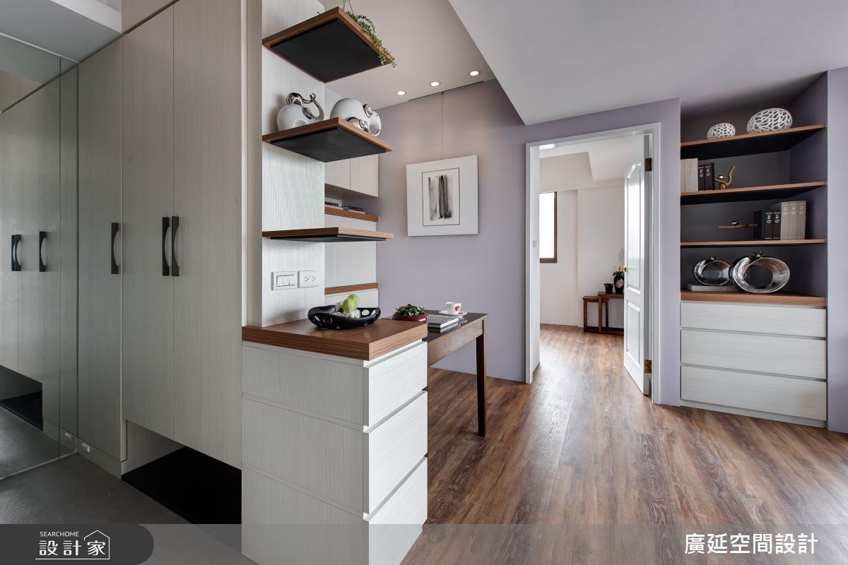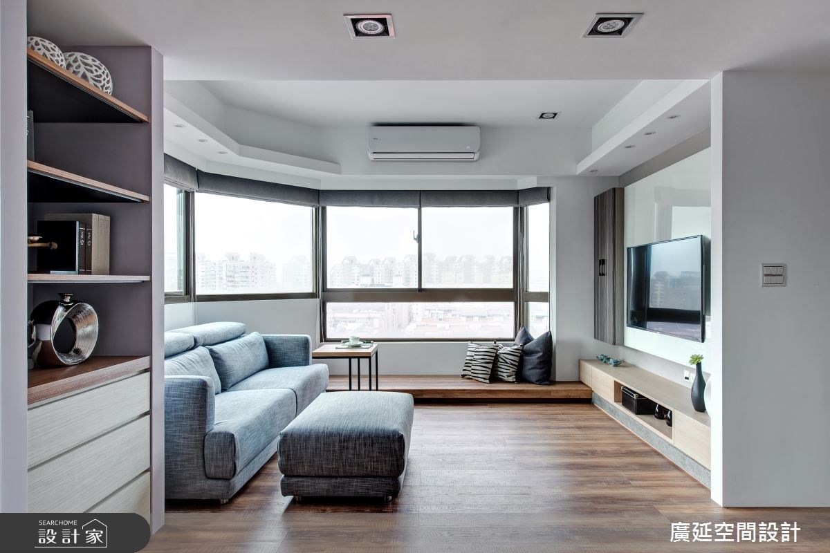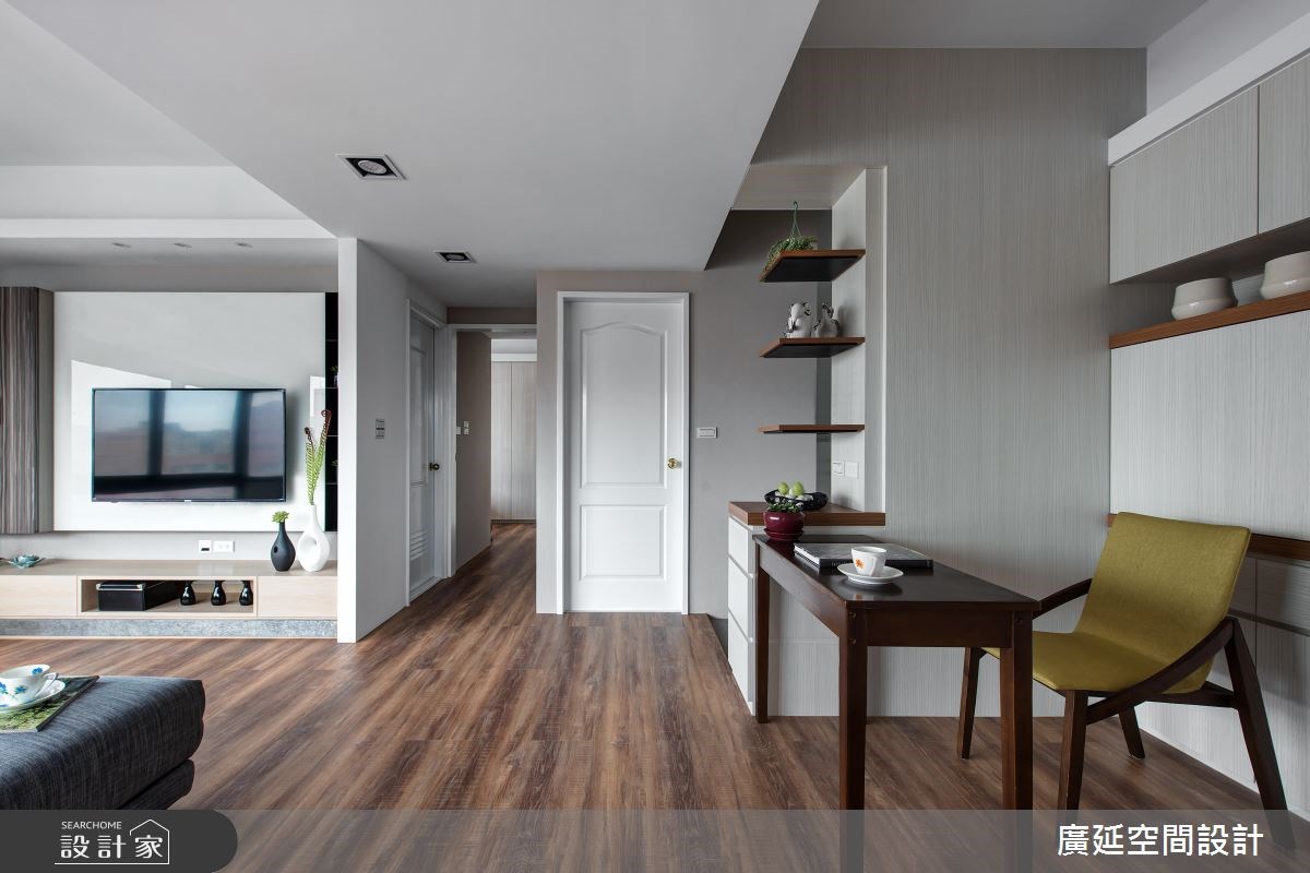 走過十年歲月的中古屋,是該好好整頓一番!廣延空間設計將整個空間通通打開,大面採光的安排讓戶外光線能夠走入室內,開放的隔局設計讓所有領域產生對話,形成共享和共存的生活方式,讓小宅頓時放大一倍。 入門後的玄關處,巧妙利用收納櫃圍塑出一小塊落塵區,搭配一面穿衣鏡後,讓進出的屋主能夠端詳穿著;客廳以八角窗的設計方式,可欣賞戶外的都會景緻,同時引入充沛自然光,讓家屋更顯通透、明亮;黑白色系創造出電視牆俐落的現代感,一旁搭配木紋收納櫃,以及下方的木作電器櫃,挹注溫潤質感,下方搭佐花藝與器皿設計,調和一股的人文風尚,讓家倍感溫馨情誼;公領域裡,藉由電視牆、沙發擺設與沿窗利用架高木地板設置臥榻區,形塑方正的隔局,彰顯領域的核心角色;為了在有限空間裡滿足單身生活,將所需的機能化繁為簡,室內沒有規劃餐廳區,僅在靠牆處擺設一張書桌兼餐桌機能,當作閱讀或用餐來使用,成為多功能書房區。