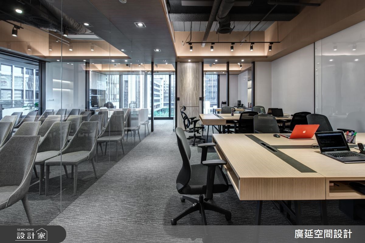 廣延空間設計為澳勝集團的台北辦事處進行空間規畫,善用新建大樓的 L 型採光面,為 40 坪空間帶來俐落、時尚的辦公氛圍。 由於這個辦公室坐擁兩面採光的基地優勢,設計師取消制式辦公室隔間,採用全玻璃劃分大會議室、主管辦公室以及員工辦公區,延攬外部綠意藍天、創造明快風景。天花刻意部分不封頂,讓原始的空調、消防管線外露,搭配木皮與軌道燈,增添時髦的工業氣息。員工辦公區採用討論座位,搭配移動式白板,更能隨時進行小組會議。需要些微隱私性的主管辦公室,則採用獨立玻璃隔間進行區別。 小編的最愛 視野、採光皆良好的空間,不同於一般只靠日光燈、零採光的辦公室,不僅可以提升工作效率、又能維持好心情!