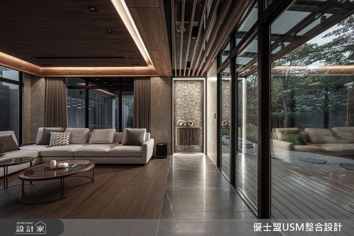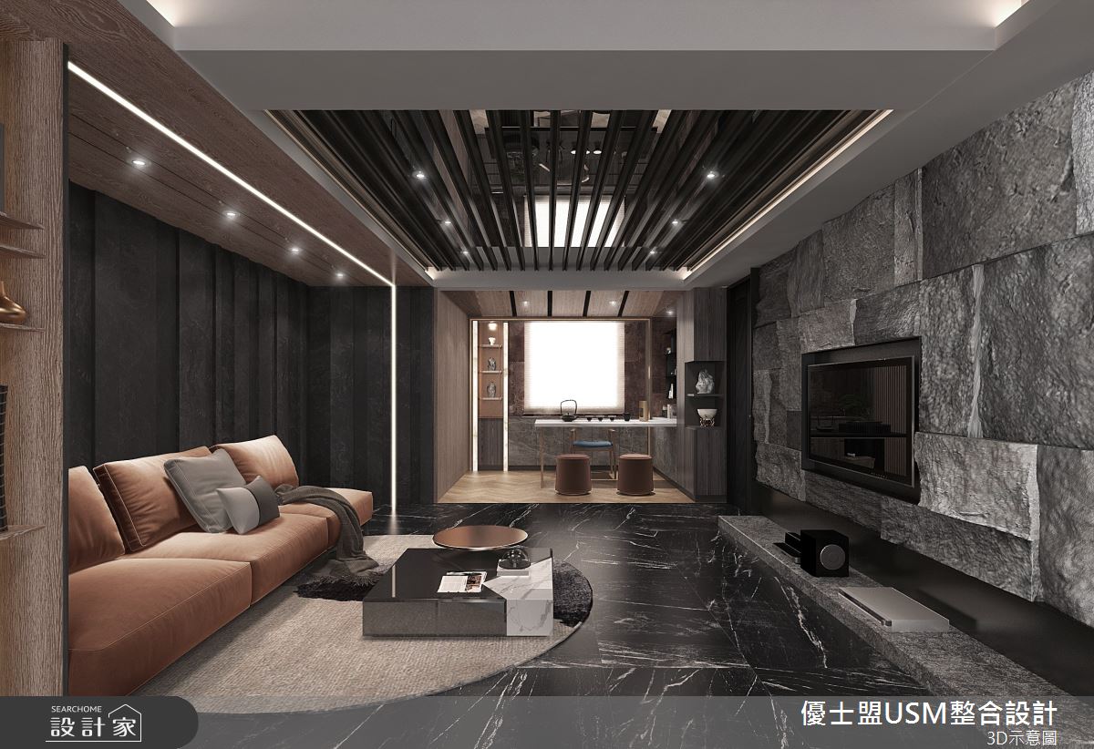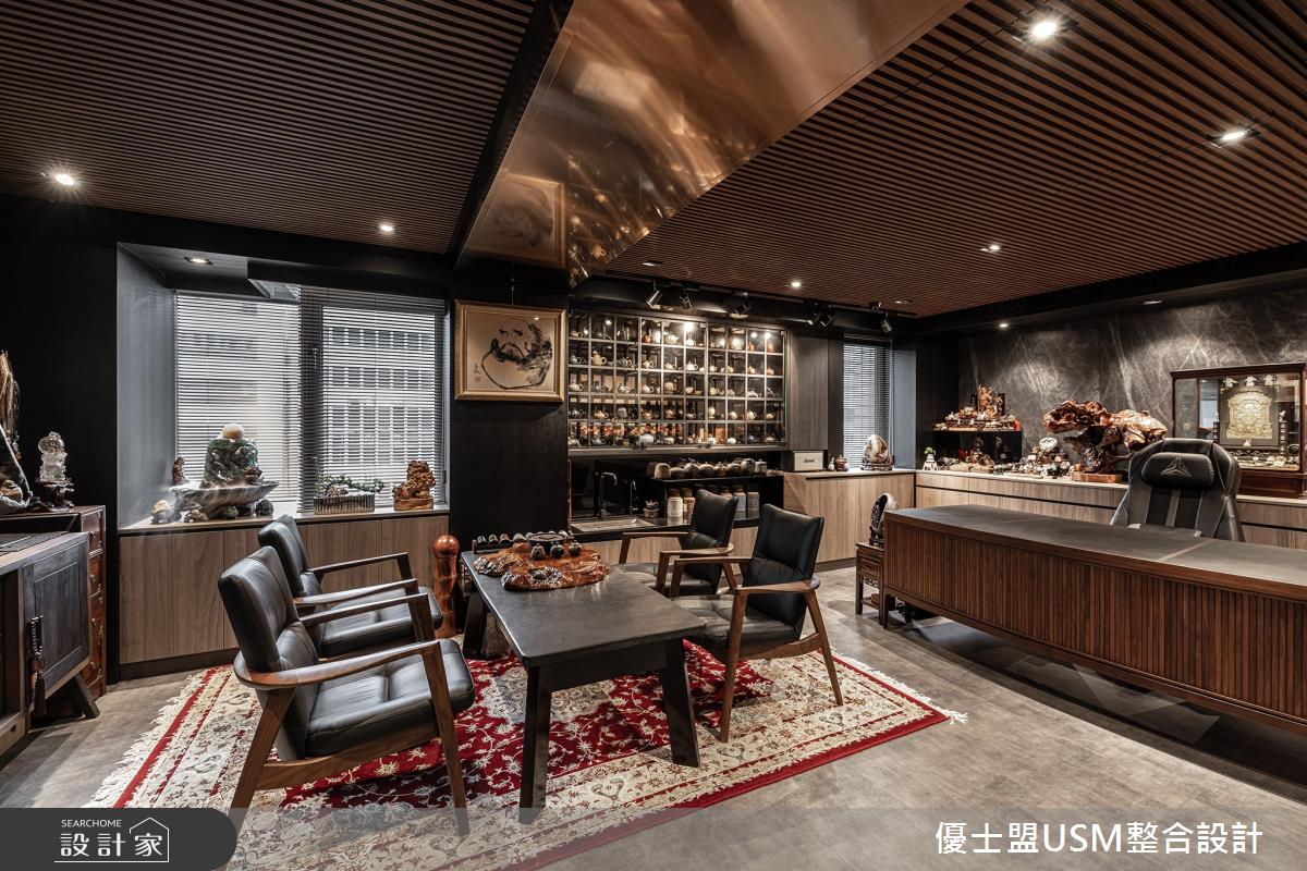 優士盟整合設計以鐵件、大理石、木皮、古銅、格柵、玻璃磚、薄岩板的搭配應用,呈現人文禪風居家氛圍,將此間90坪、三房、單層、中古屋(5~15年)打造成舒適愜意的家庭空間,完成全家人的夢想之居。