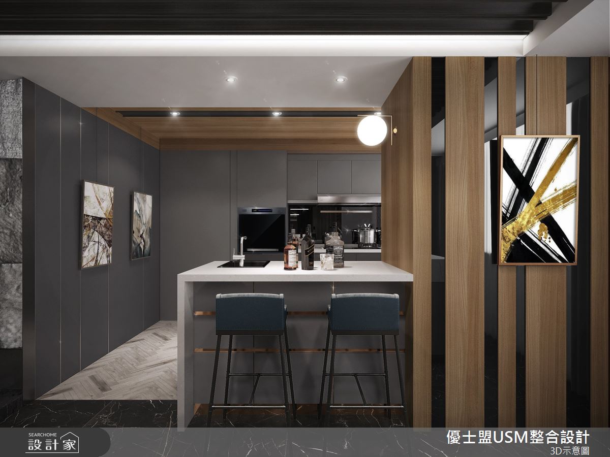 來自優士盟整合設計的20坪現代風住宅案,屋主一家人共有1位大人,是一間單層老屋(31~40年)的兩房格局,設計師藉由建材以乳膠漆、超耐磨木地板、木紋磚、特殊漆、鍍鈦、超耐磨地板、塗裝木皮的搭配應用,實現一家人的理想生活。