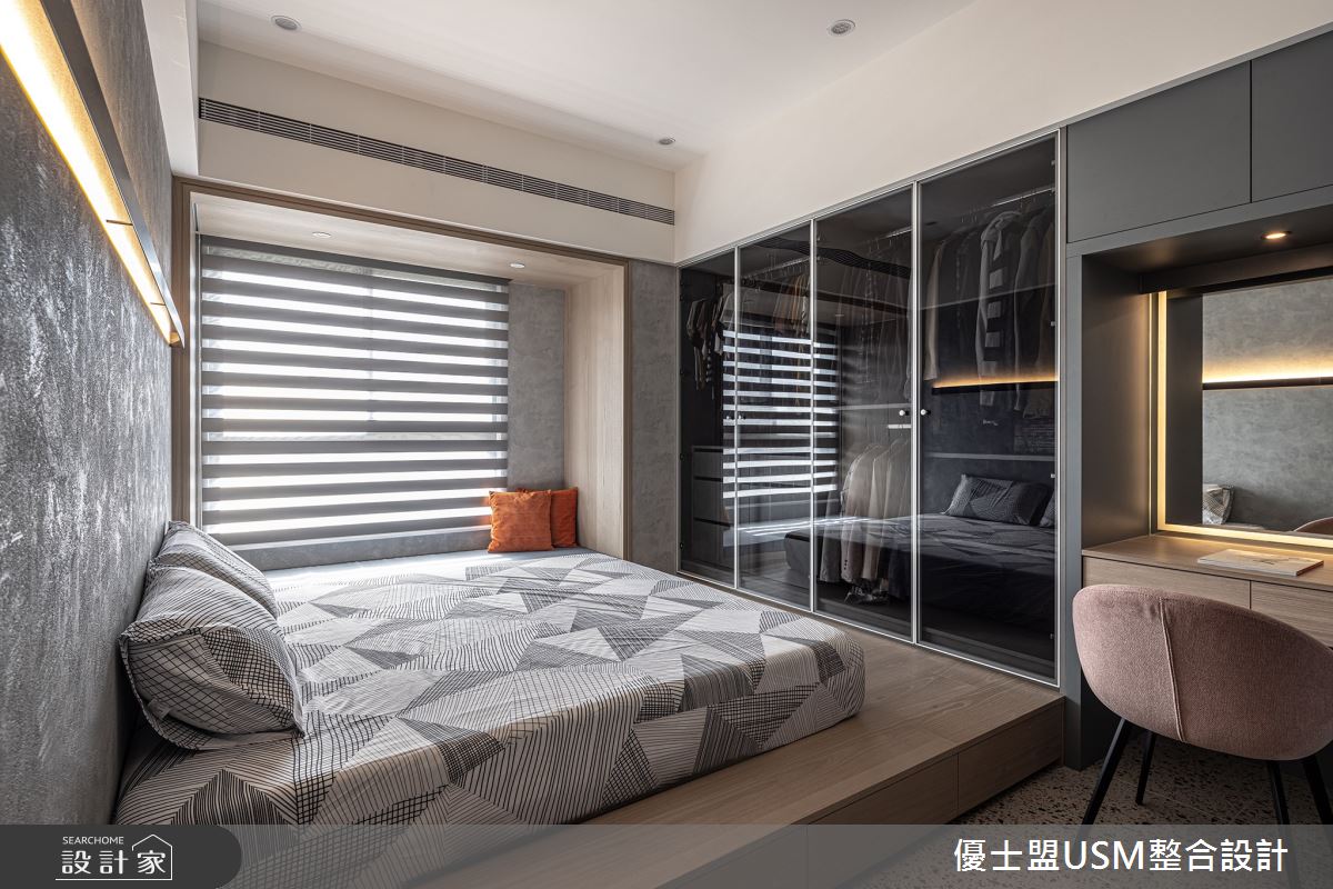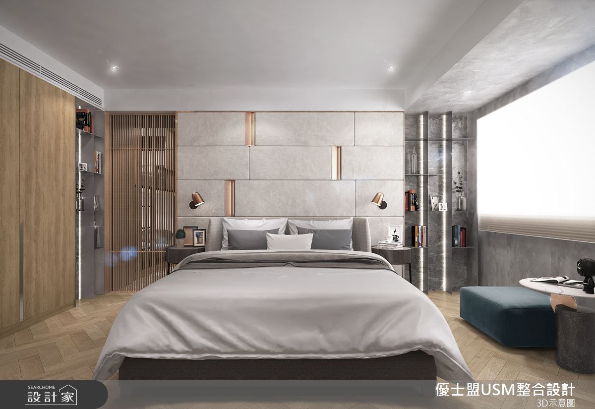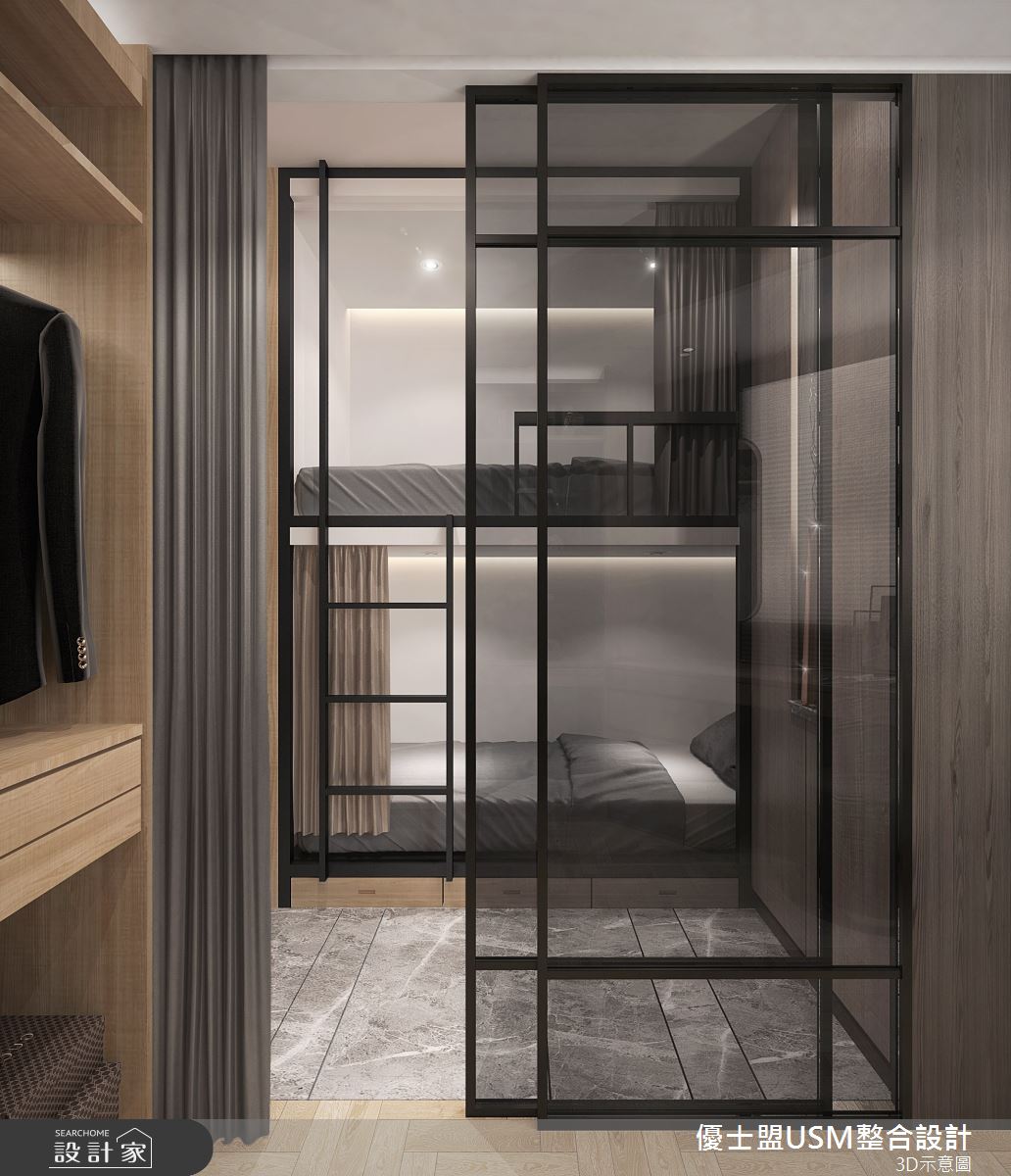 優士盟整合設計以乳膠漆、壁紙、超耐磨木地板、鐵件、灰鏡、茶玻、鍍鈦金屬、木作貼皮、烤漆、壓克力、鋼刷木皮、人造石、賽麗石、軌道燈、石材、繃布、噴砂玻璃的搭配應用,呈現現代風居家氛圍,將此間85坪、四房、透天別墅、新成屋(5年以下)打造成舒適愜意的家庭空間,完成2位大人、2位小孩全家人的夢想之居。