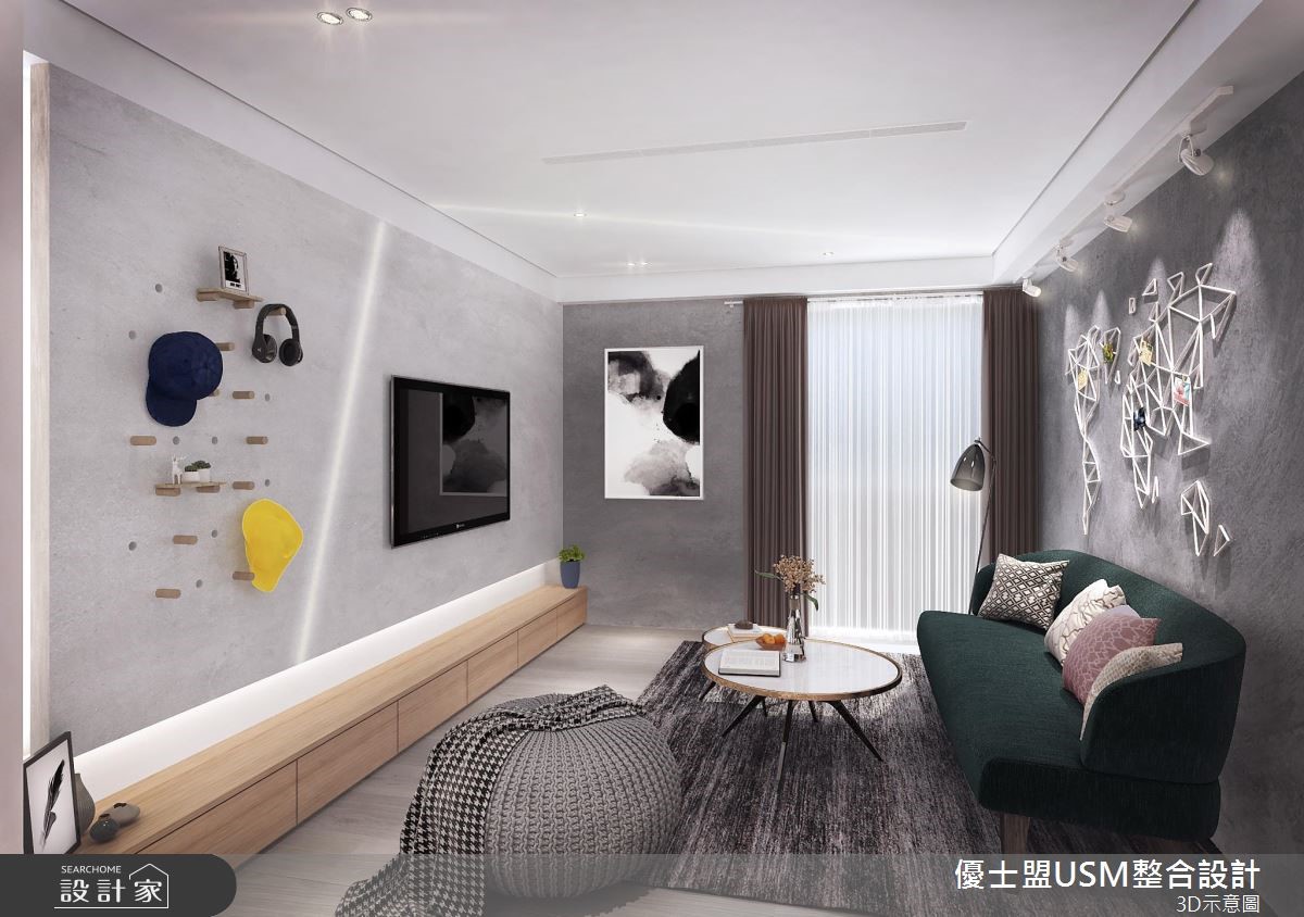 20 坪北歐風居家,設計師將規劃重點放在利用空間、創造空間,並依循屋主有烘焙的興趣、平時喜愛下廚,所以在有限空間內,以精準的設計手法打造出大的廚房場域,且兼顧生活中的一切收納機能,快跟著小編一起來看看吧! 玄關區域,規劃淡色懸吊鞋櫃減輕視覺龐大感受,讓人進門後可直接在櫃體下方暫放鞋子,搭配洞洞板的設計,即便生活用品裸露在外,也充滿隨興趣味,構築生活品味的展現,客廳沙發背牆則加入幾何線條立體裝飾,結合照片的妝點,堆疊空間的趣味性與活力;廚房則為本案的設計重點,採以半開放的格局,享有更具餘裕的動線與空間感,同時配置轉角吧檯,兼顧一絲隱密遮蔽性,並以彩色磚面鋪敘地坪,定義專屬的使用範圍,以實用而齊備的設備機能,滿足屋主熱愛下廚的夢想! 小編的最愛 主臥打造延伸整道立面的收納衣櫃,讓格局顯得簡潔又時尚,並選擇讓櫃門跳色,迅速達到活潑空間表情的效果!
