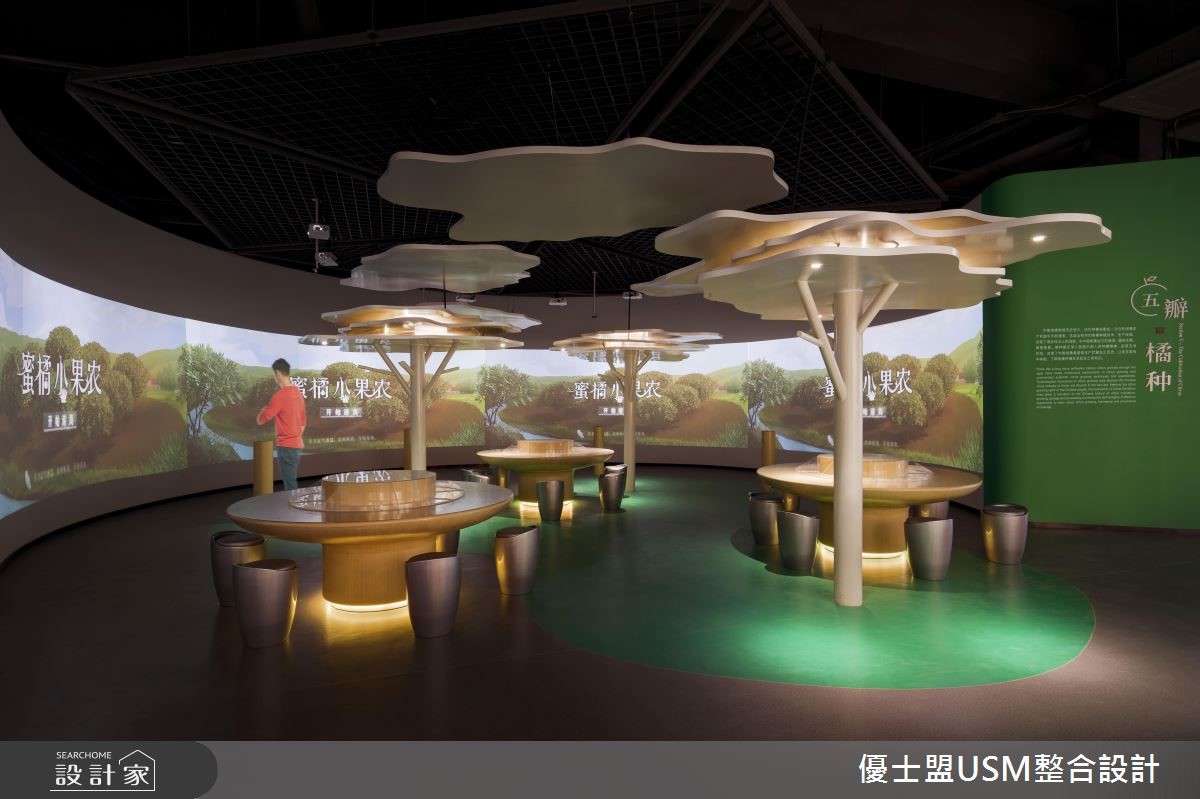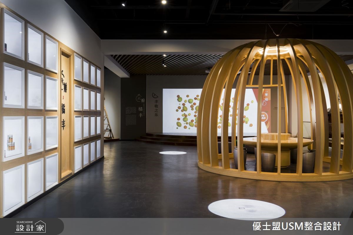 300 坪現代風展場,為一間柑橘博物館,從柑橘歷史到文學賞析區分出八大主題館,藉由五感體驗帶民眾感受不同層面的柑橘知識。展覽入口以橙色與黑色搶眼配色佐圓形天花震撼造型,完美呼應柑橘主題,揭開導覽序幕! 八個展區名稱以剝橘概念,一瓣、二瓣依序命名,傳遞層層深入了解柑橘意境。每個展間天、壁、地運用沉穩的深黑色包覆,配合精準打燈設計,以凸顯每個展間的重點,同時製造出展間獨有的靜謐氣氛。第一個展區-橘緣,牆面宛如大型簡報,將柑橘發展、習俗、傳播地圖條理分明地展示,空間中央不規則休息座椅區,與天頂燈條相輝映,豐富層次與趣味;第二個展區-橘美,為影視、教學互動區,視聽空間從天花到座位區以圓弧手法規劃,具有聚焦民眾視線效果;第五個展區-橘種,以介紹種植方法為主軸,一側環繞式視聽導覽外,另一側以網格牆設計將種植時所需器具,清晰展示於立面;第六個展區-橘丰,重點設計則在於休息區的外觀,利用木層板造型表現一片片橘瓣意象。 小編的最愛 第四個展間橘文,以介紹關於柑橘文學作品為重點,其中一處牆面,設計師打造佈告欄造型張貼文學作品,空間中心擺放文學著作,立面延伸至天花的流線設計,以山水畫造型搭配詩句,讓民眾走進展間感受徜徉文學的美好。