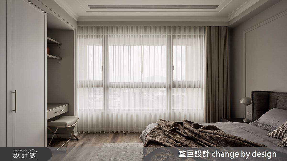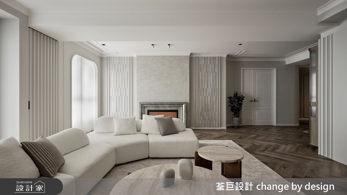 本案為荃巨設計change by design的35坪混搭風新古屋(10年以下)設計作品,格局為單層三房的居住空間。全室建材的搭配,應用藝術塗料、大理石、壁紙、不鏽鋼、訂製家具、人字拼木地板,展現溫馨的居家氛圍。