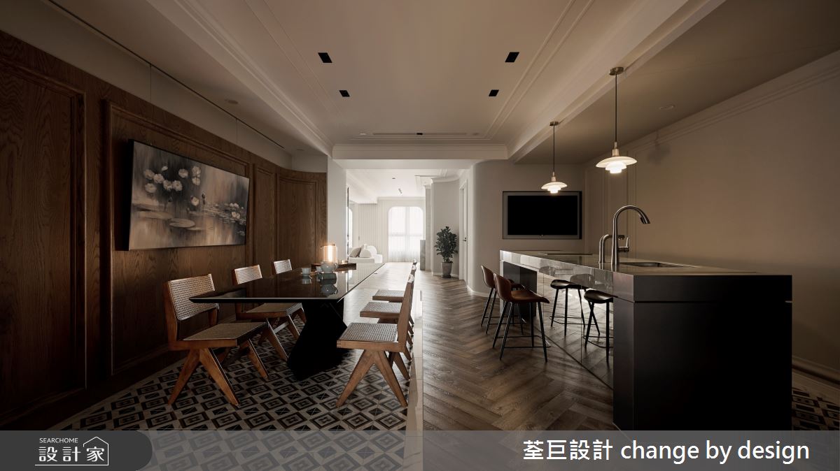 由荃巨設計change by design精心規劃的60坪三房住宅空間,家庭成員一共有3位大人。因應屋主需求,設計師運用混搭風作為主軸,搭配油漆、花磚、木地板、石英磚/拋光石英磚、鐵件、茶玻、烤玻、鍍鈦金屬、木作貼皮、烤漆、系統板材、大理石、樂土、人造石、賽麗石、珪藻土、皮革、石材、繃布、線板、噴漆,打造全家人的夢想家居。