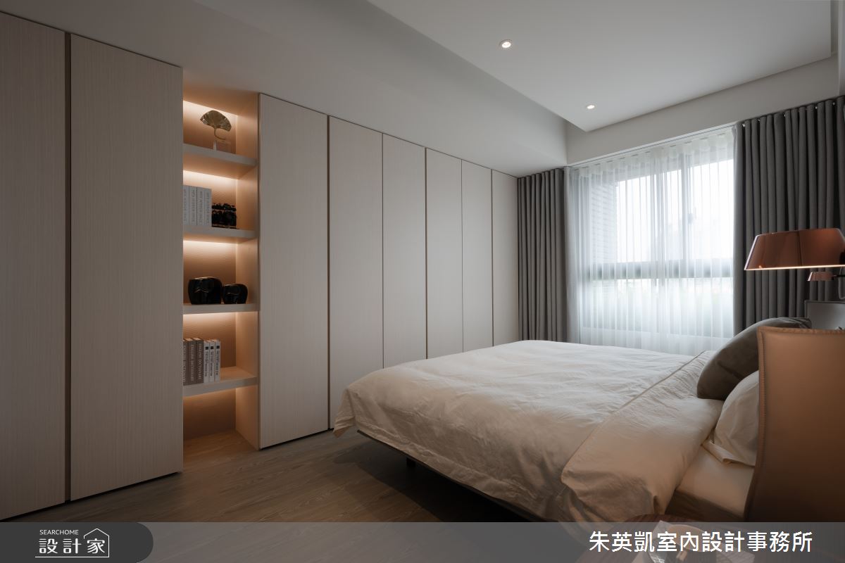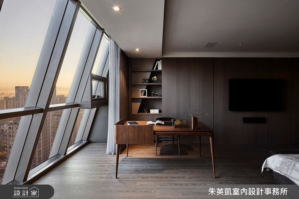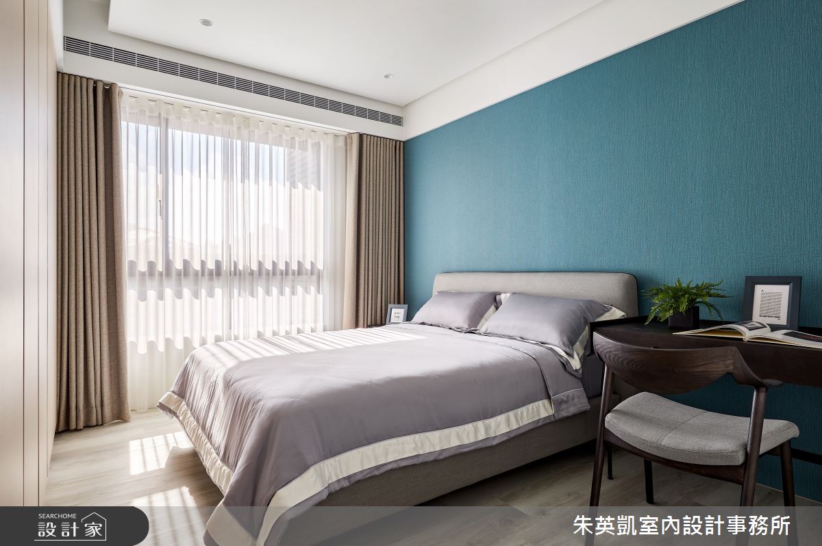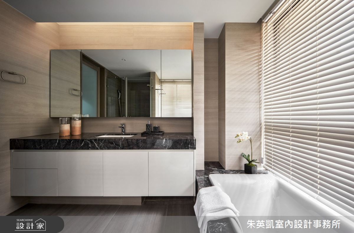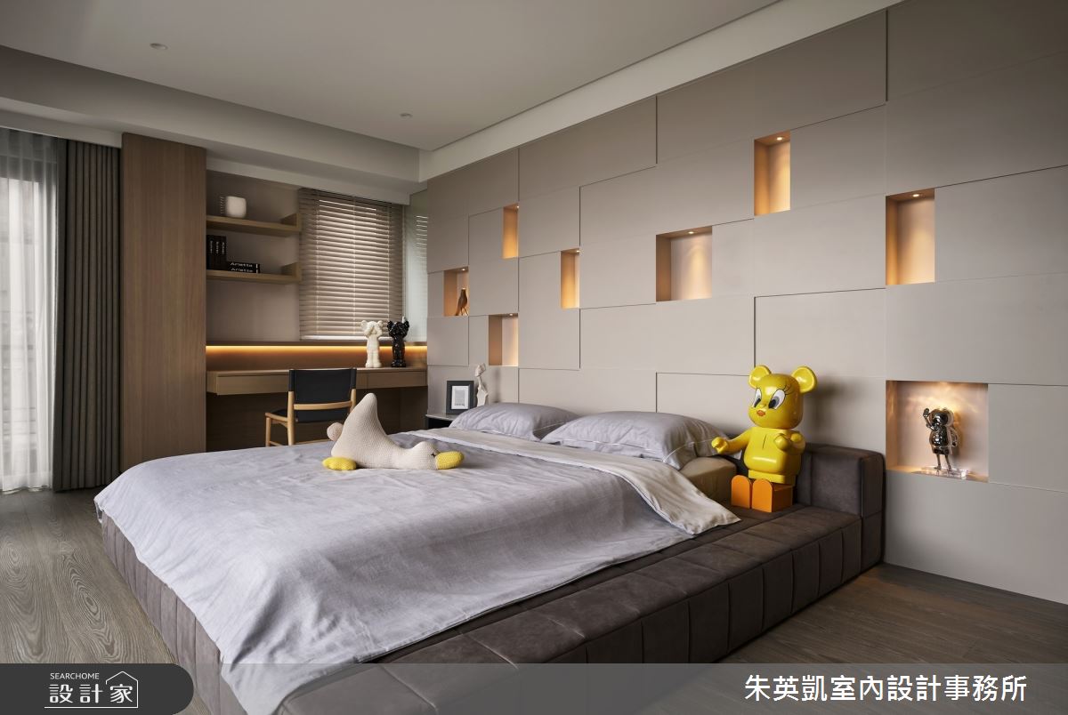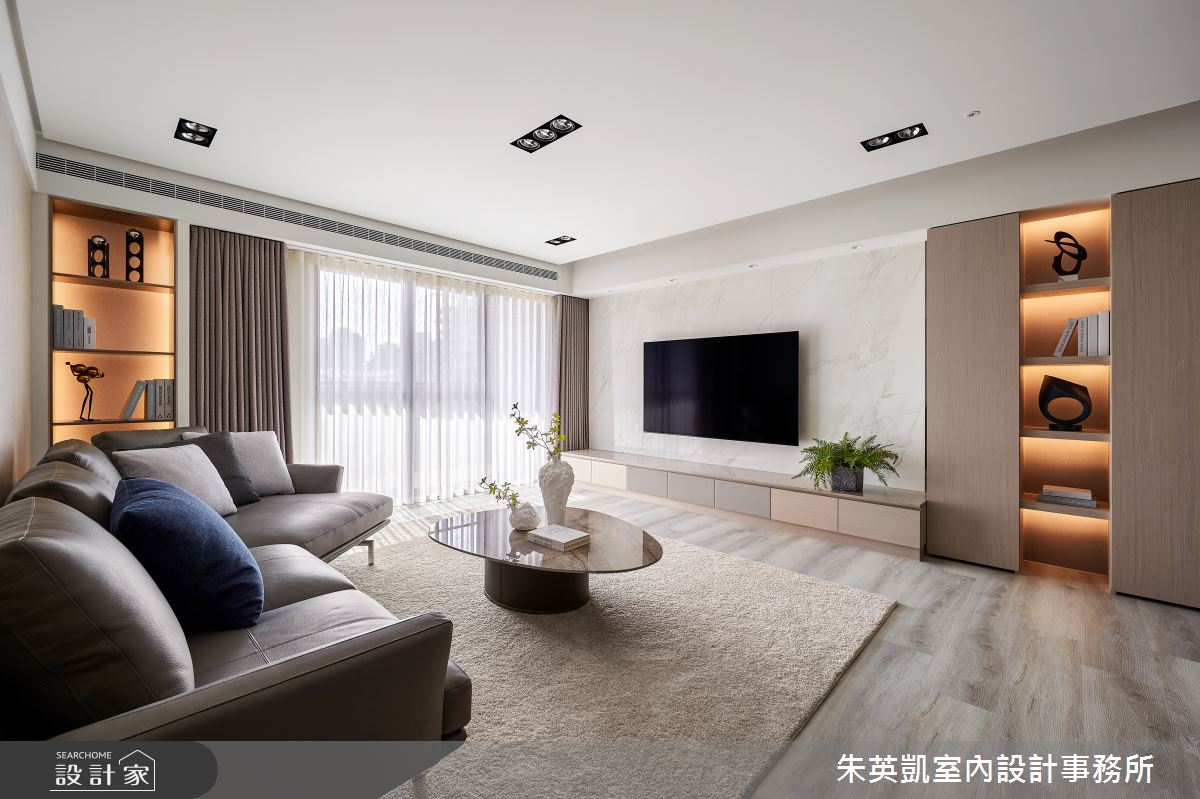 朱英凱室內設計事務所以油漆、超耐磨木地板、石英磚/拋光石英磚、木作貼皮、鋼刷木皮、大理石、木百葉、人造石、石材、噴漆、日本特殊漆的搭配應用,呈現現代風居家氛圍,將此間30坪、四房、單層、新成屋(5年以下)打造成舒適愜意的家庭空間,完成2位大人、2位小孩全家人的夢想之居。