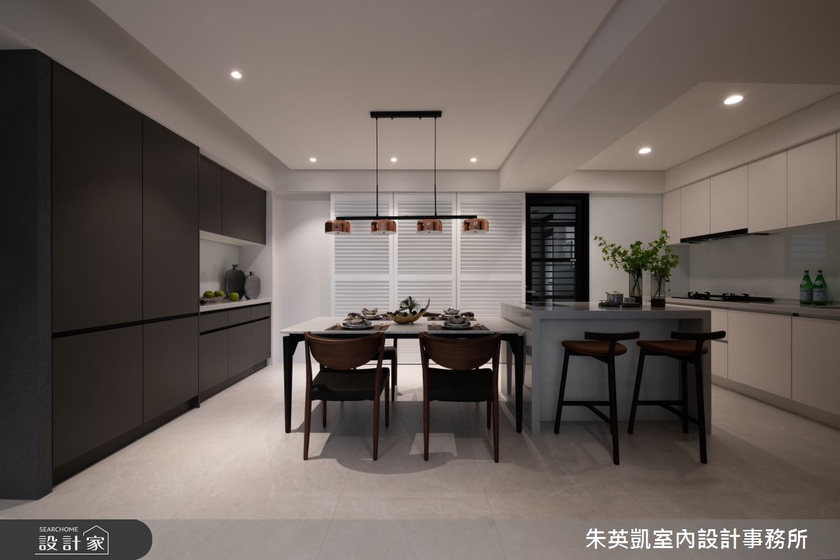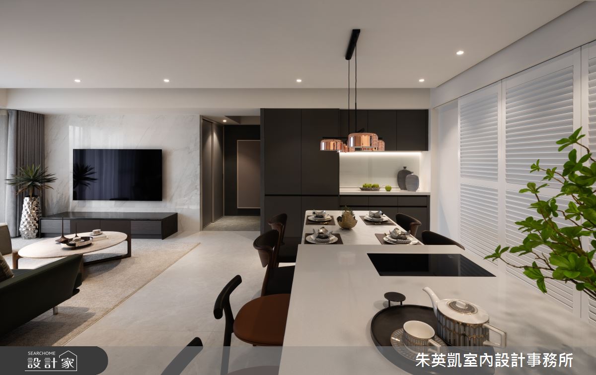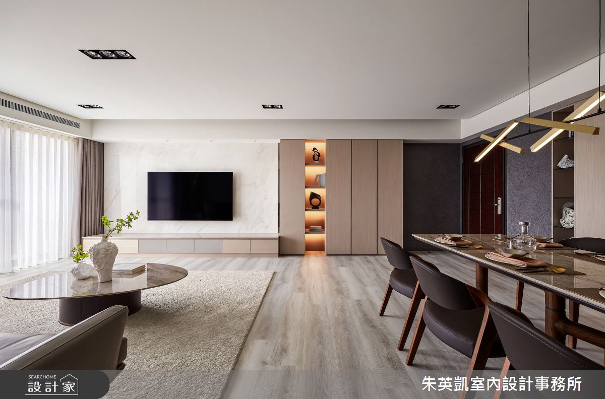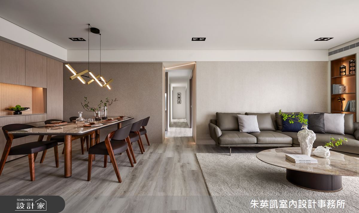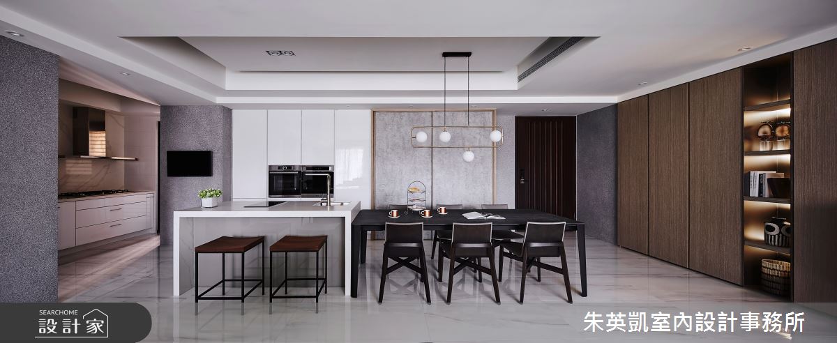 來自朱英凱室內設計事務所的130坪現代風住宅案,屋主一家人共有2位大人、2位長輩,是一間單層新成屋(5年以下)的三房格局,設計師藉由建材以壁紙、水泥漆、超耐磨木地板、石英磚/拋光石英磚、鐵件、大理石、木百葉、人造石、日本陶藥漆(特殊漆)的搭配應用,實現一家人的理想生活。
