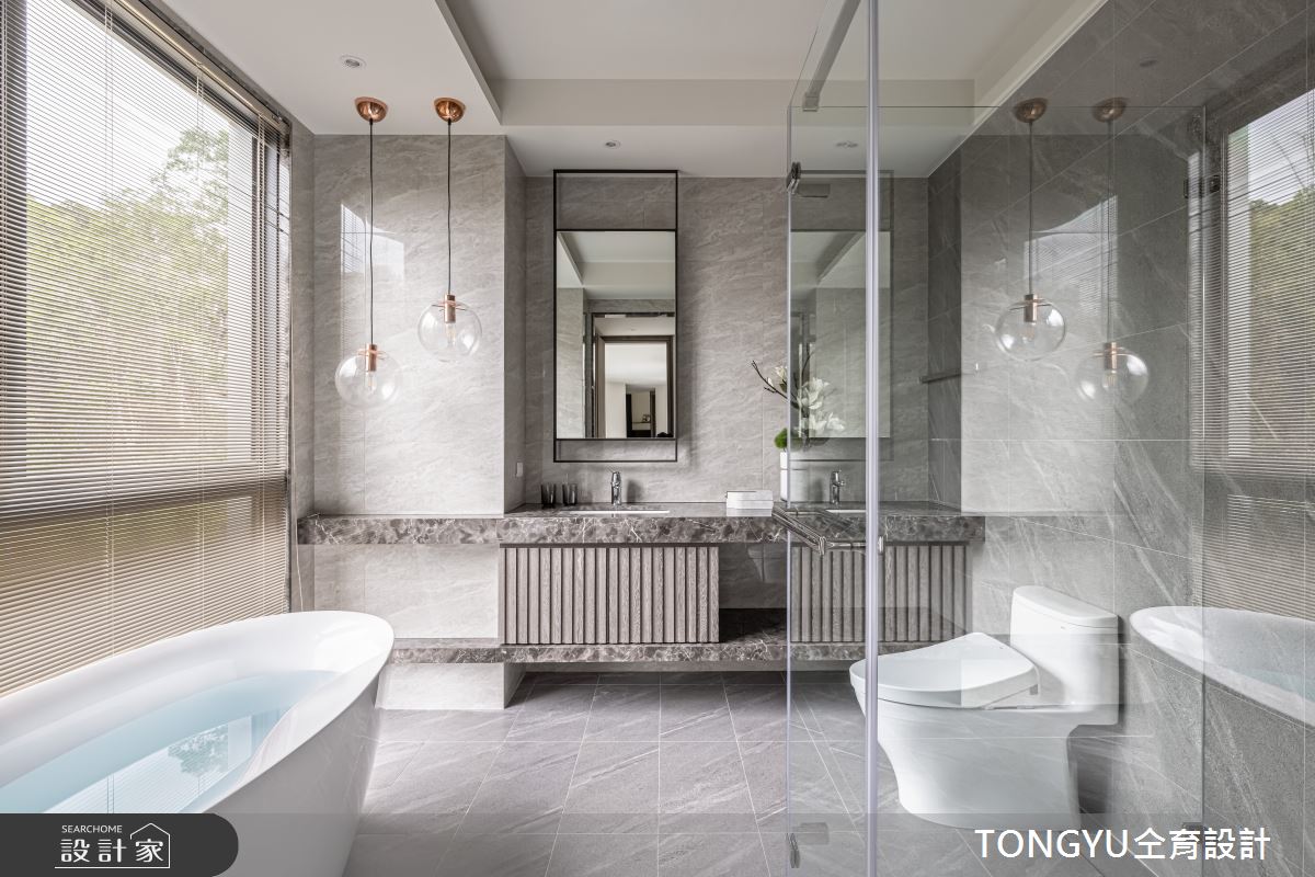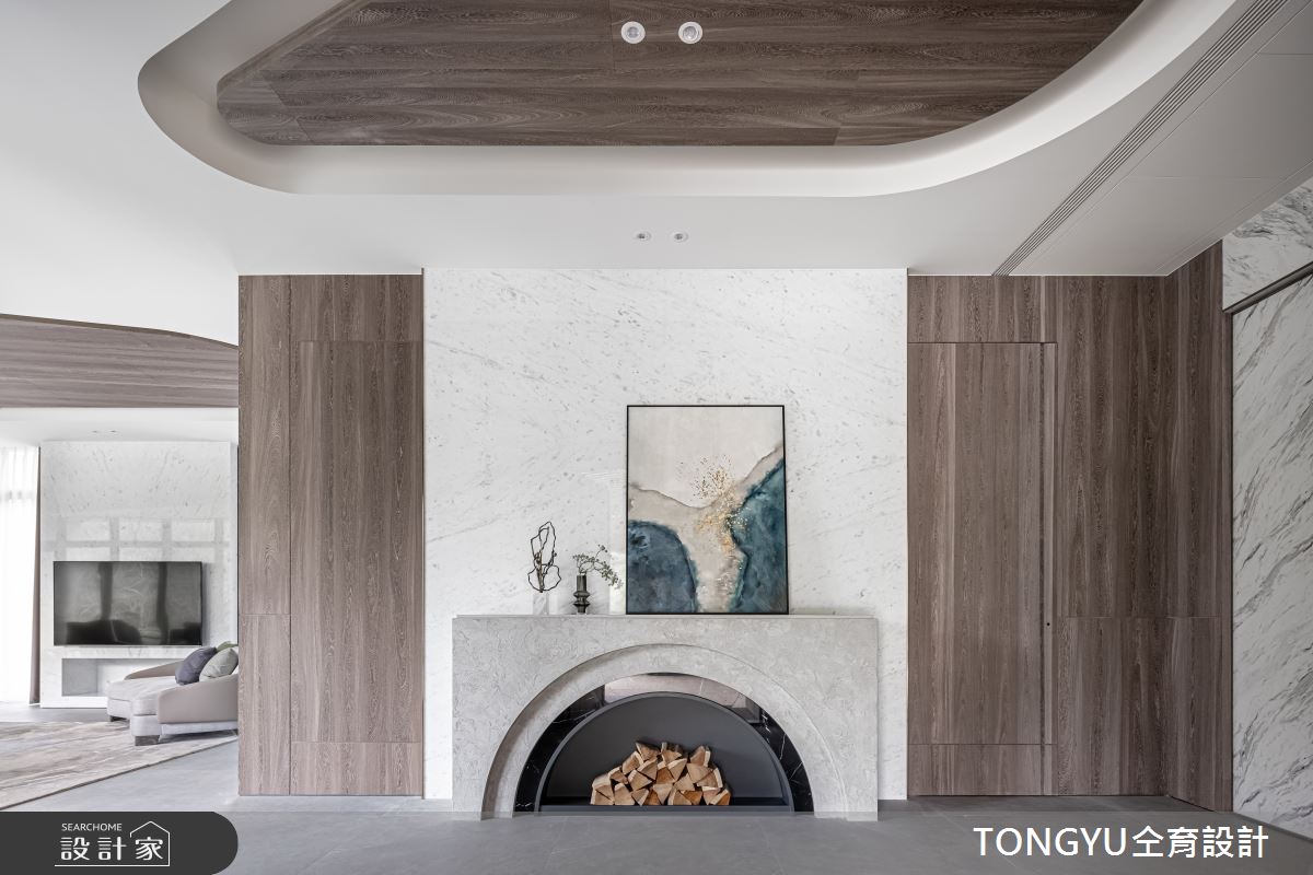 仝育設計以壁紙、鐵件、茶玻、鍍鈦金屬、木作貼皮、皮革、石材、繃布的搭配應用,呈現現代風居家氛圍,將此間139坪、五房、透天別墅、新成屋(5年以下)打造成舒適愜意的家庭空間,完成全家人的夢想之居。