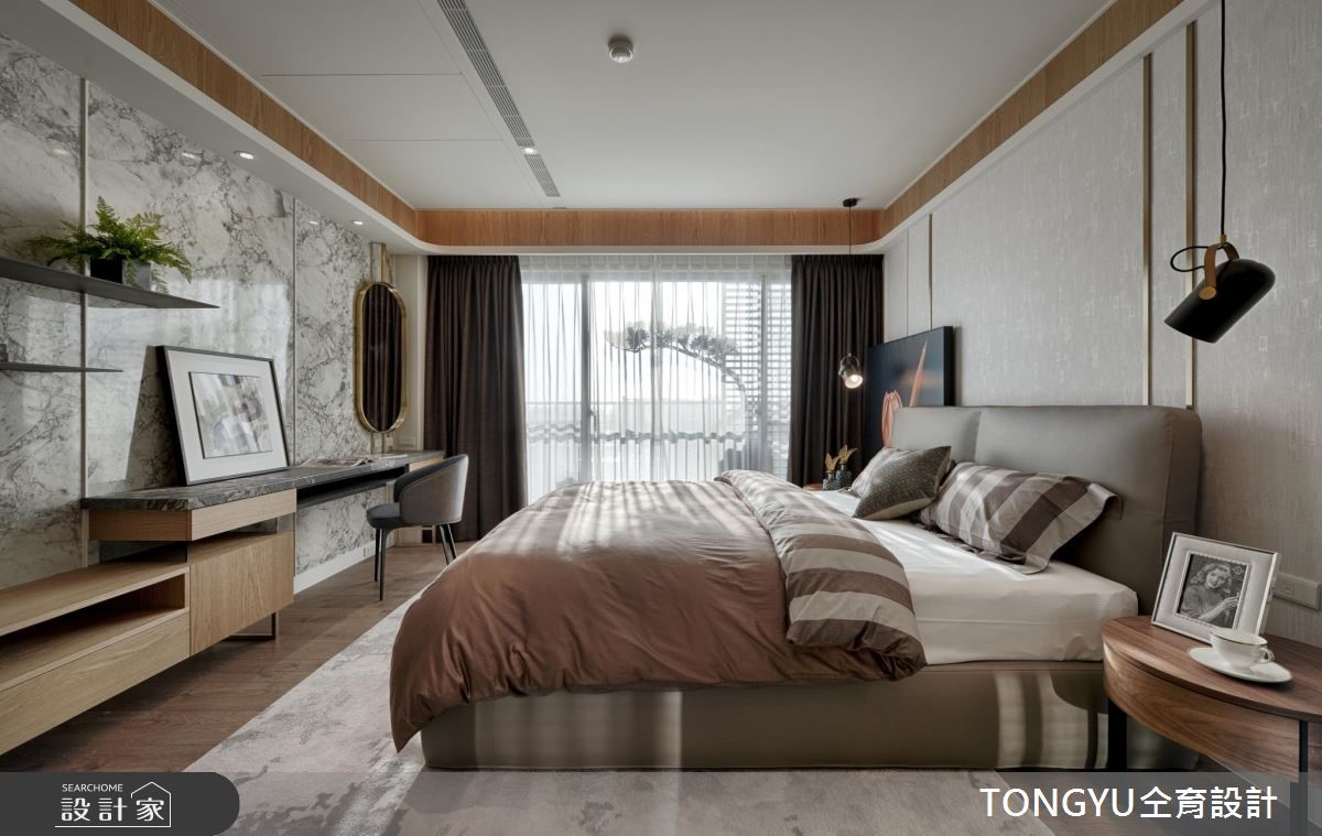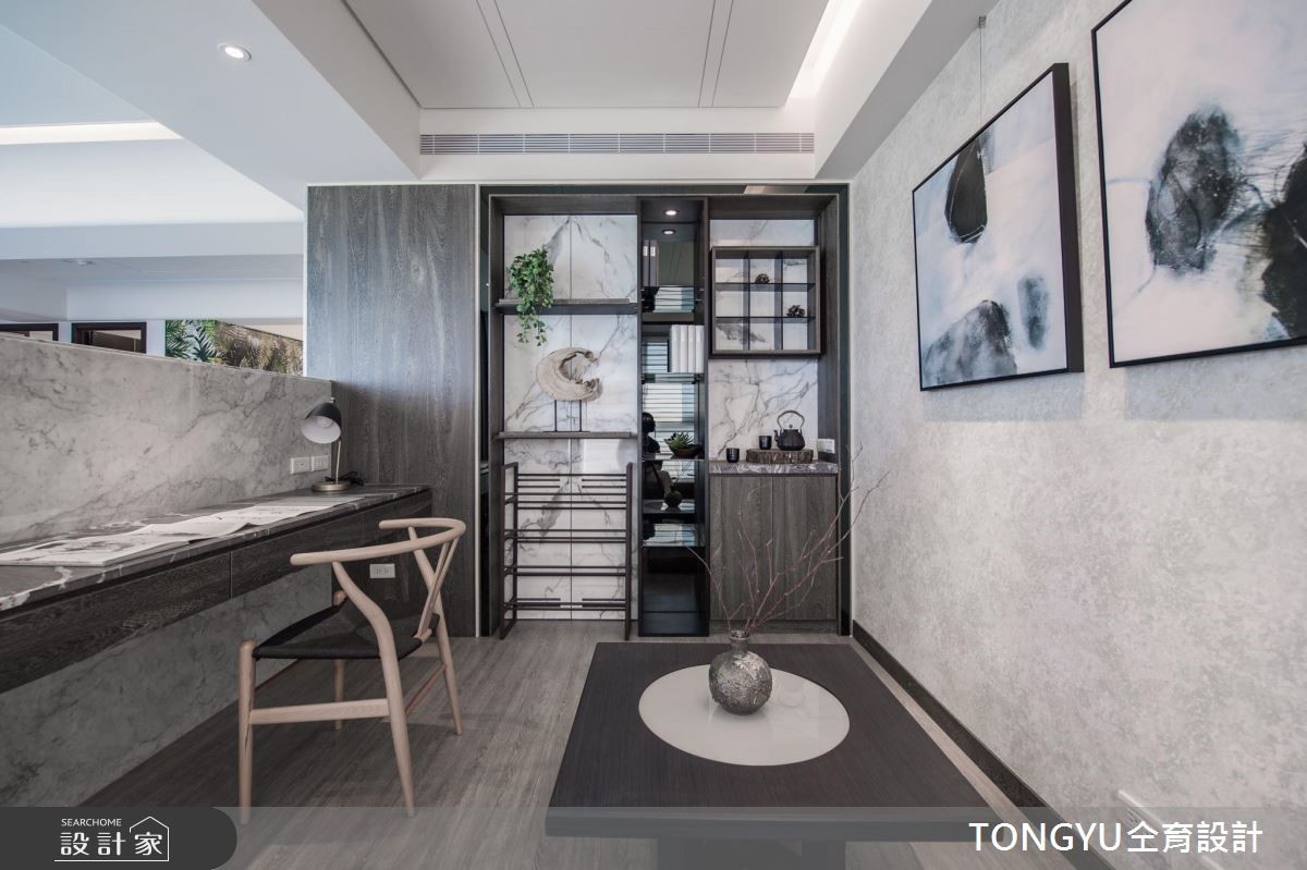 70 坪現代風大宅,以木紋石材與大理石紋定調主視覺,低彩度帶出內斂沉穩的空間氛圍,並運用綠色植栽點綴空間色彩及注入室內活力 ! 大面積石紋電視牆將客廳區視覺延伸放大,皮質沙發與地毯等軟件選用互相搭配,呈現低調奢華質感。餐廳區展示收納擺置許多美型花器,將植栽化身裝置藝術,增加空間色彩且提升公共空間的鮮活感。沙發後方進入私領域的廊道,運用拉門設計將臥房隱匿於公共區域。私領域利用木質感搭配柔和光線,營造睡鋪紓壓氛圍,並利用空間打造收納機能十足的專屬更衣間。 小編的最愛 其中一間臥房將書桌配置於睡鋪及臥榻之間,動線配置良好,將三個各自擁有不同機能的空間完美串聯。且利用深色系配件混搭木質元素,打造放鬆氛圍。