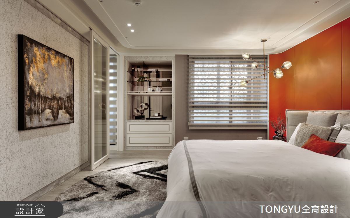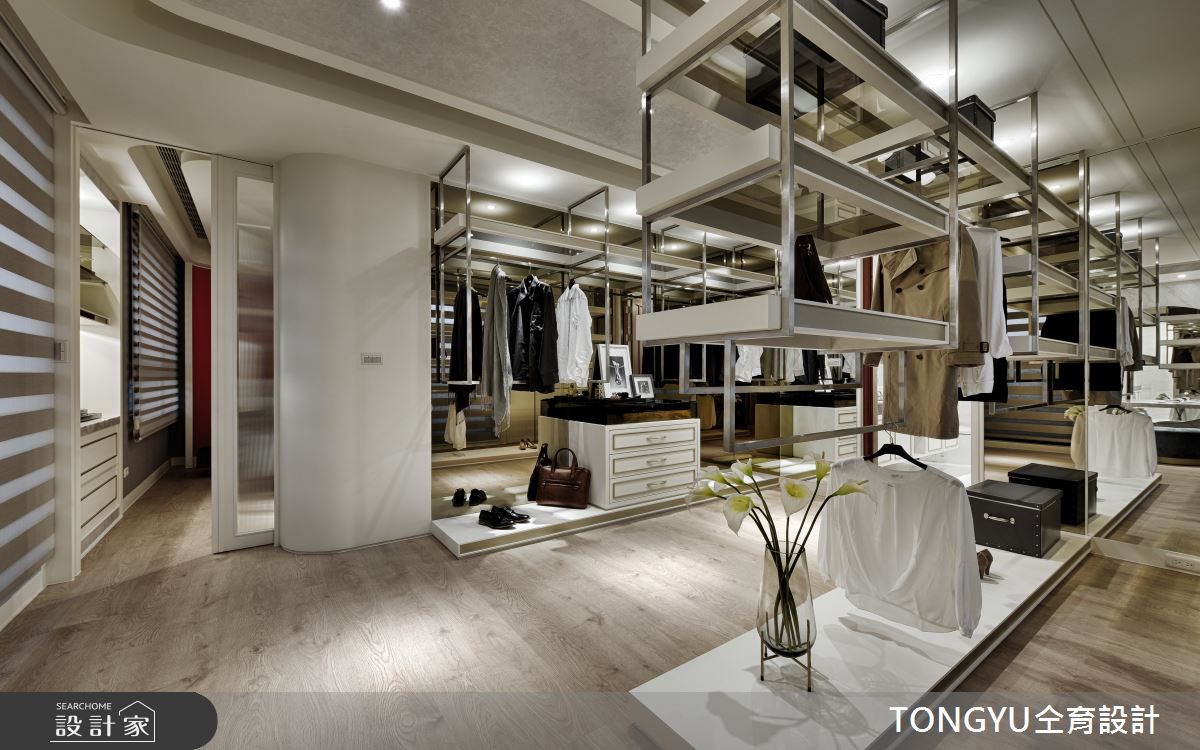 仝育室內裝修設計以壁紙、鐵件、灰鏡、大理石、皮革、仿清水模塗料、灰玻、小冰柱玻璃、鈦金、薄板、磁磚、橡木、茶鏡的搭配應用,呈現現代風居家氛圍,將此間93坪、三房、單層、預售屋打造成舒適愜意的家庭空間,完成2位大人全家人的夢想之居。
