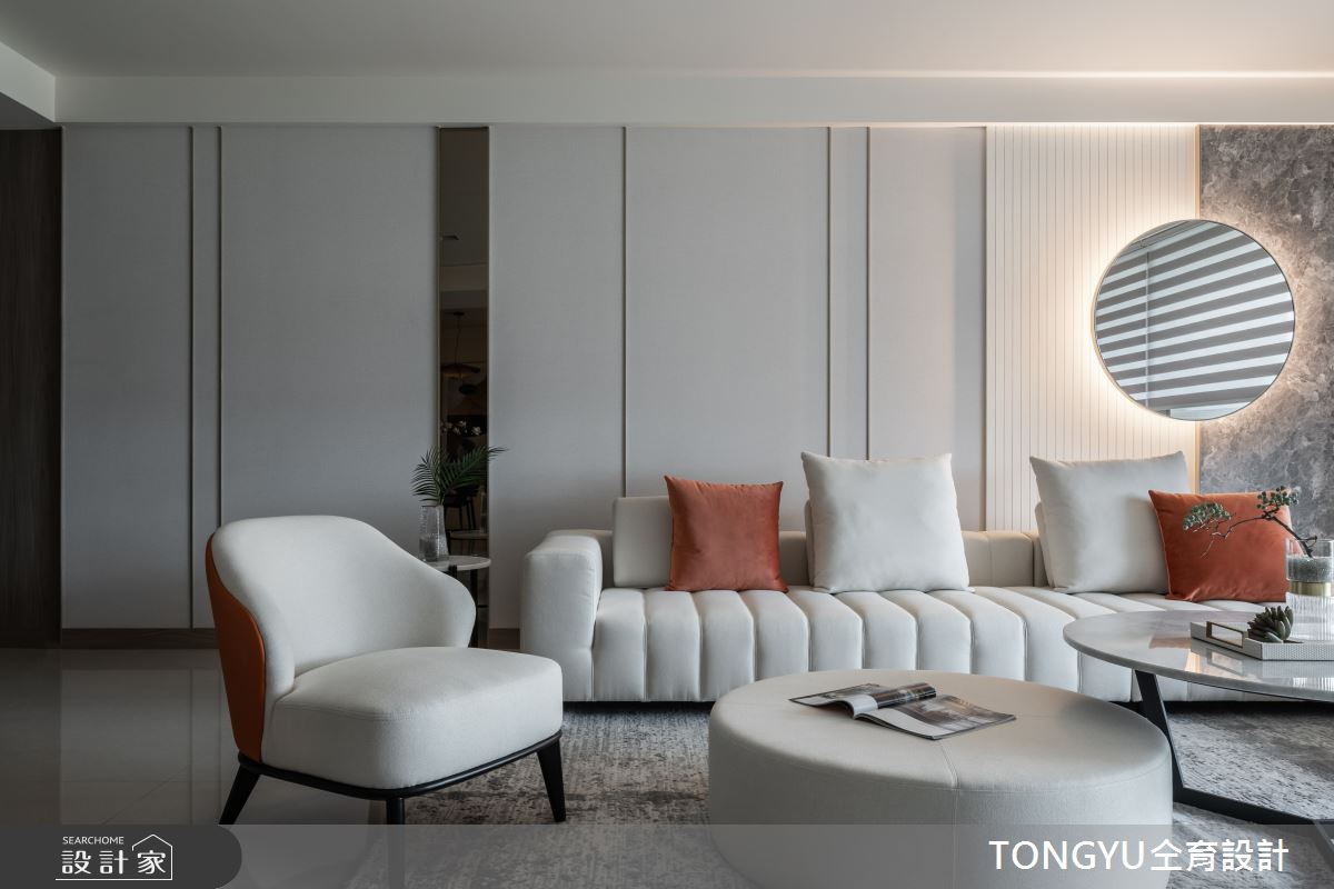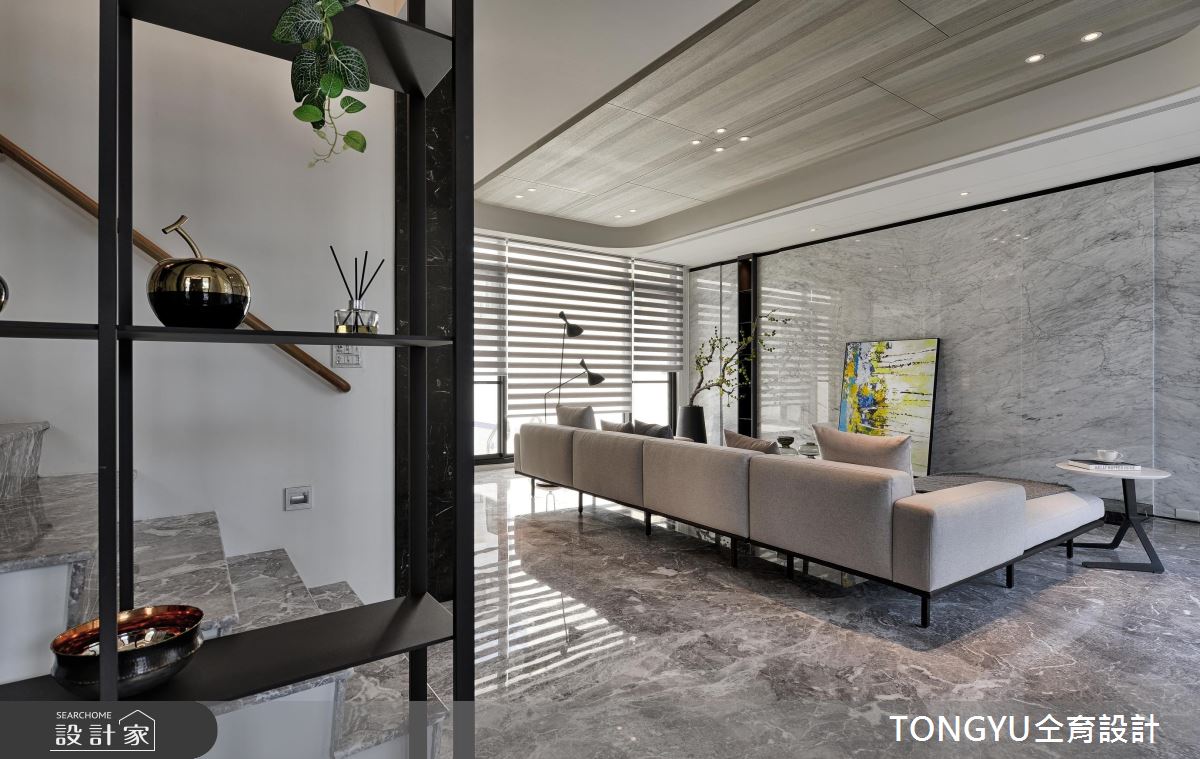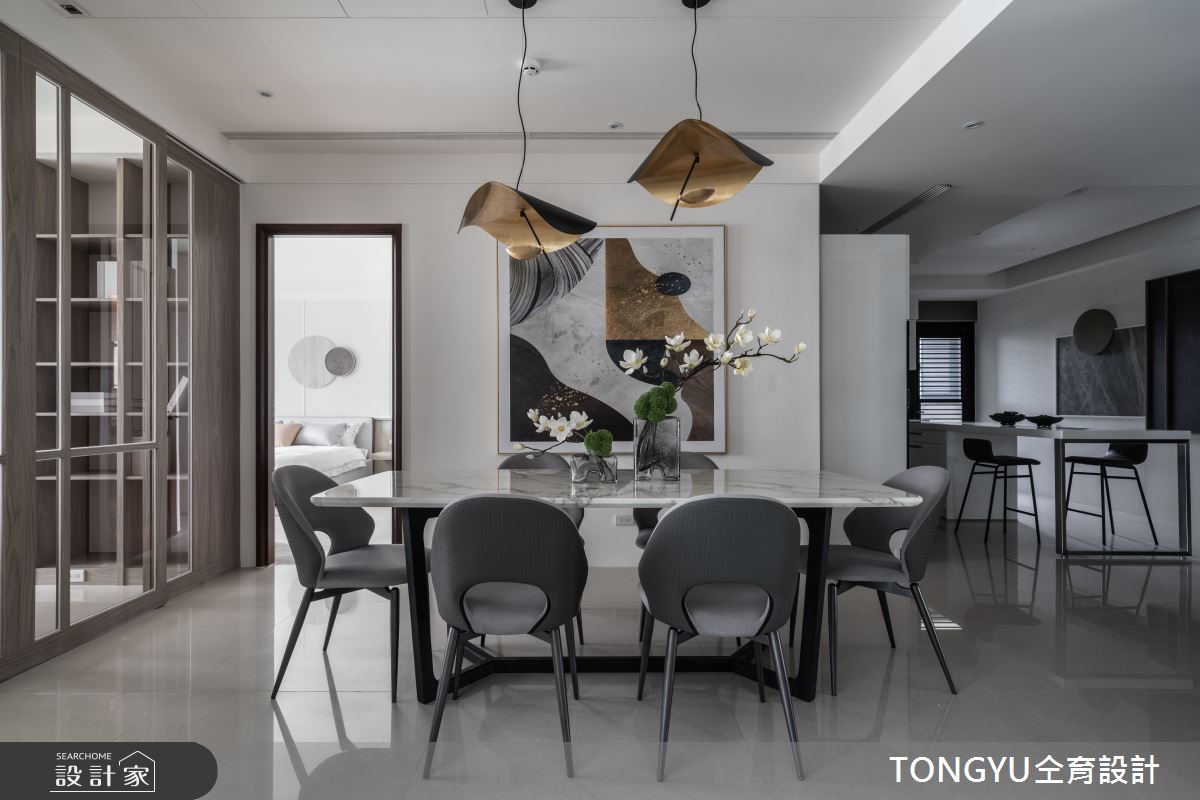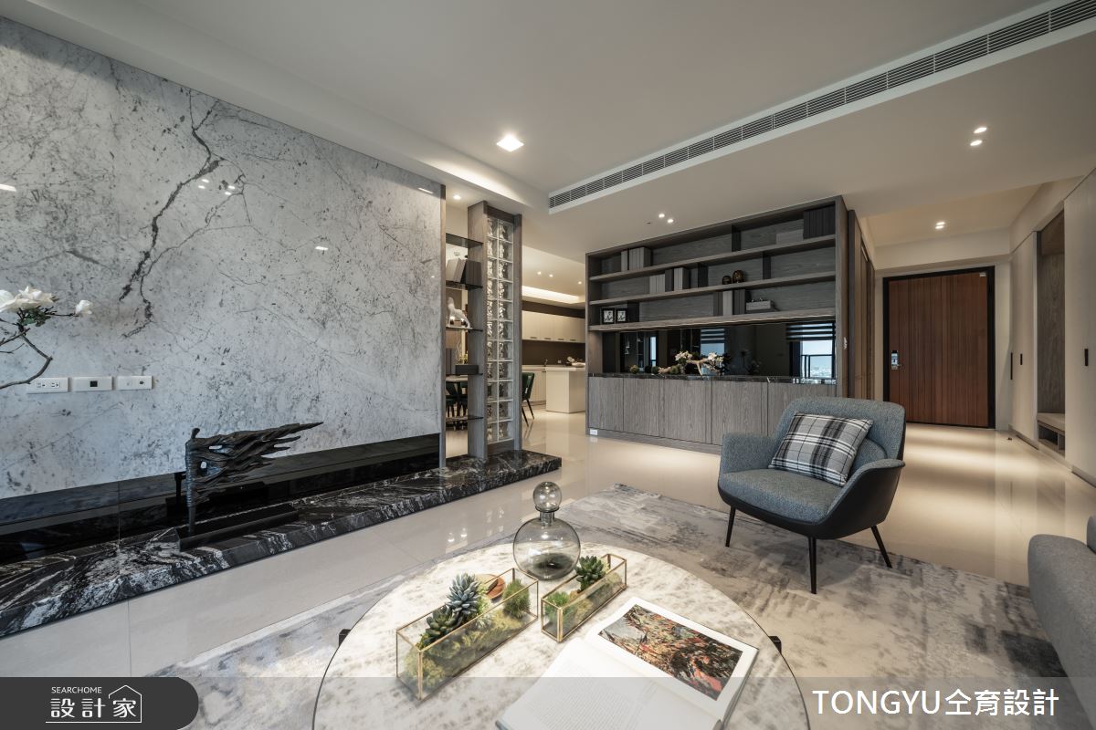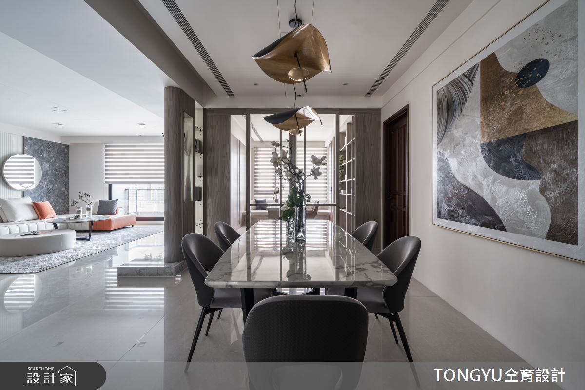 來自仝育室內裝修設計的123坪休閒風住宅案,是一間單層新成屋(5年以下)的三房格局,設計師藉由建材以卡拉拉白大理石、皮革、木皮、烤漆、壁布、玻璃、光带、镀钛金属的搭配應用,實現一家人的理想生活。