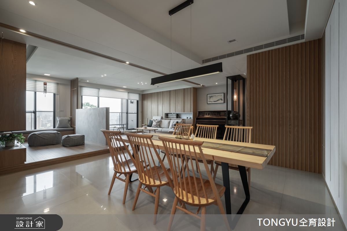 來自仝育室內裝修設計的78坪休閒風住宅案,屋主一家人共有4位大人,是一間單層預售屋的三房格局,設計師藉由建材以壁紙、超耐磨木地板、木地板、榻榻米、鐵件、茶玻、大理石、樂土、石材的搭配應用,實現一家人的理想生活。