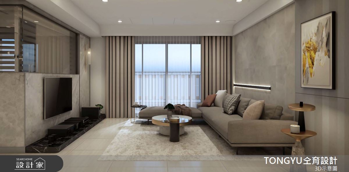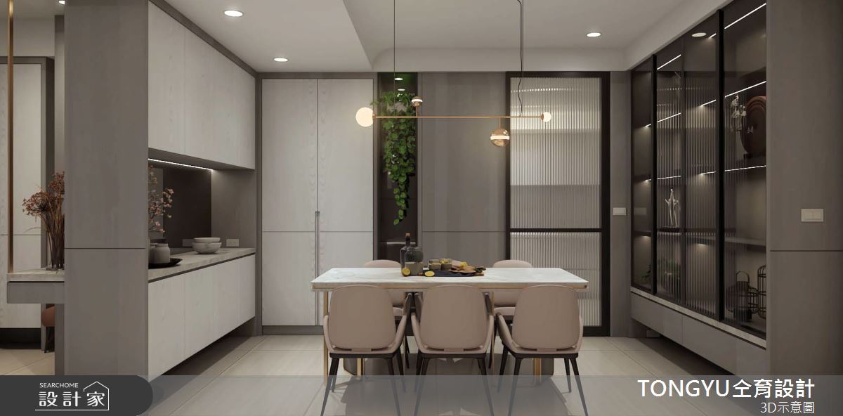 來自仝育室內裝修設計的95坪現代風住宅案,是一間單層預售屋的三房格局,設計師藉由建材以壁紙、鐵件、烤漆、大理石、皮革、茶鏡、灰玻、小冰柱玻璃、銀狐大理石、磁磚、美耐板、薄板、卡拉拉白大理石、MDF板、大理石磁磚的搭配應用,實現一家人的理想生活。