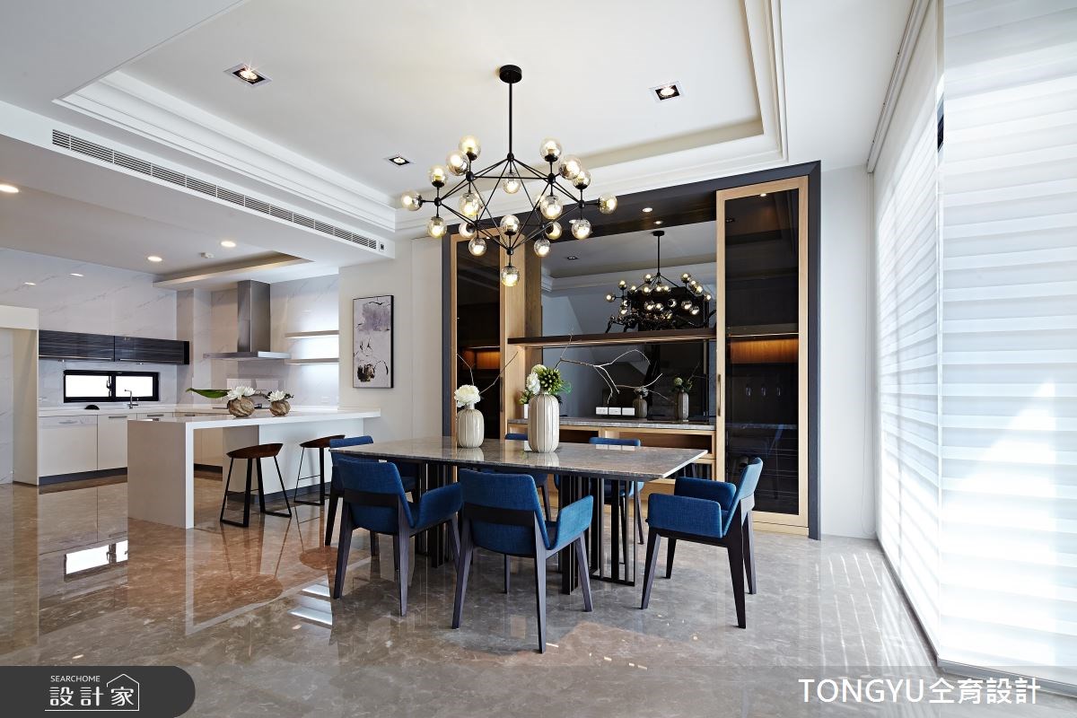 敞朗日光映照在一片簡約白的空間裡,乾淨的立面線條更顯鮮明、俐落,描繪出嶄新、純粹的雅居風貌;領域裡透過石材與木紋的演繹,搭佐展示櫃內的設計物件與家具家飾的風格展演,交織出細膩且動人的現代風格。 開放的公領域裡,以垂直水平的比例分割,展現清爽、嶄新的家屋風貌,這股風格佈局一路延伸至室內的毎一處,融入大面採光的建築特色,讓室內的人們得以享受充沛暖陽與綠意的洗禮,體驗生活在自然裡的樸實與悸動。客廳裡讓大量的白飾底,大理石材堆疊出大尺度的電視牆,底部搭配黑色石材的平台,讓立面的溝縫細節更顯鮮明,沙發後方則為開放展示機能,擺設屋主收藏的藝術品或是風格物件,賦予美學新生命;有別於客廳以白色調為基底,餐廳領域則佐入深色、暖調性,深藍色的座椅安排展現屋主與賓客的高貴、優雅,放射狀燈泡造型的吊燈不僅釋放溫度,獨特的造型更帶來新穎的設計感受,木作與灰玻門扇打造對稱式餐櫃,則挹注簡約溫馨之美,更成為公領域的視覺焦點。 小編的最愛 整體空間串連白與木紋肌理,讓冷暖風格相互呼應與調和,同時將質感與生活機能相融為一,完成內外兼修的實用好宅。