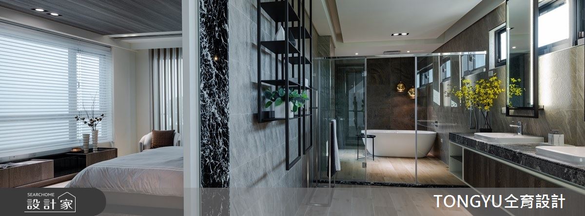 仝育室內裝修設計以卡拉拉白大理石、黑白根大理石、天然水染鋼刷鐵刀木皮、白橡木鋼刷板、高級壁板、進口壁紙、裱布、鐵件、灰玻、黑鏡的搭配應用,呈現休閒風居家氛圍,將此間90.81坪、三房、單層、新成屋(5年以下)打造成舒適愜意的家庭空間,完成全家人的夢想之居。
