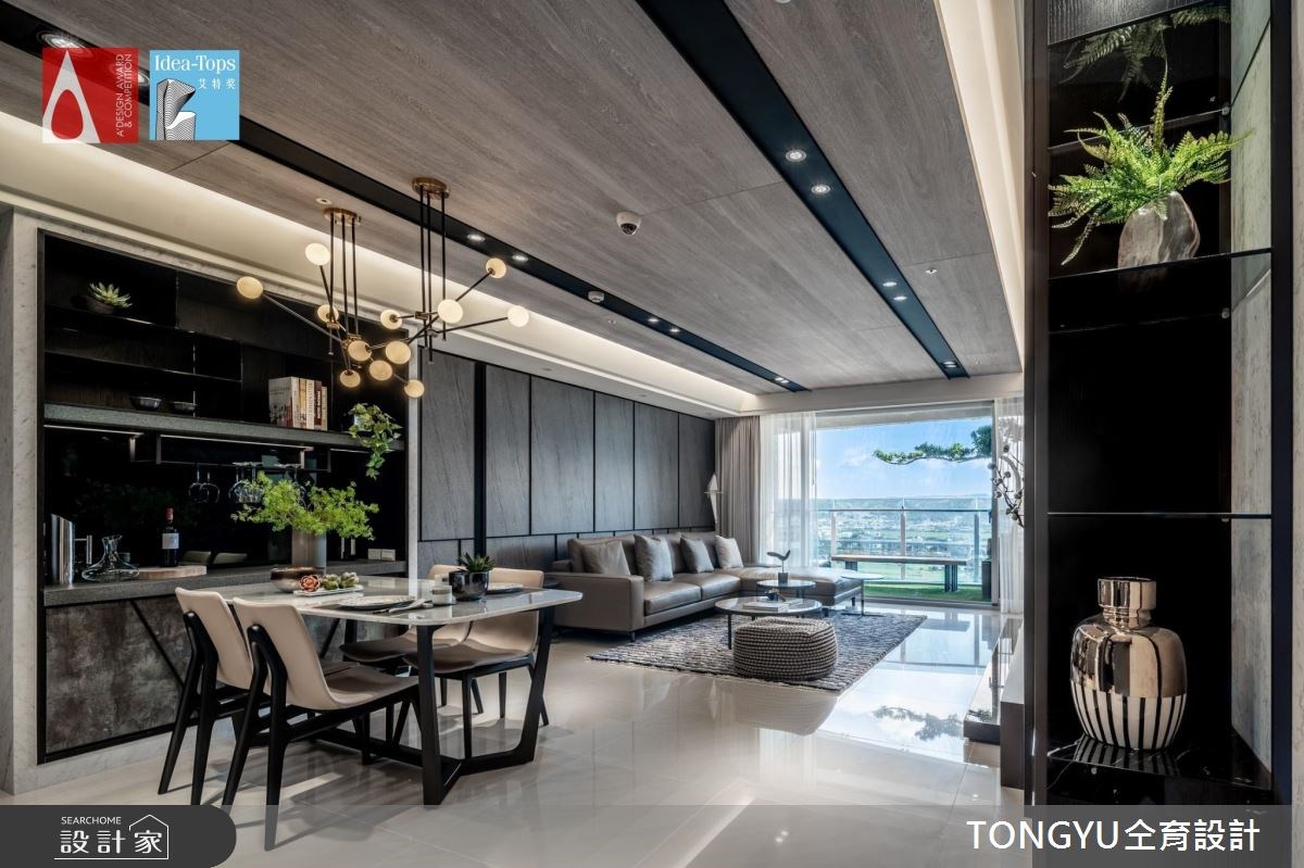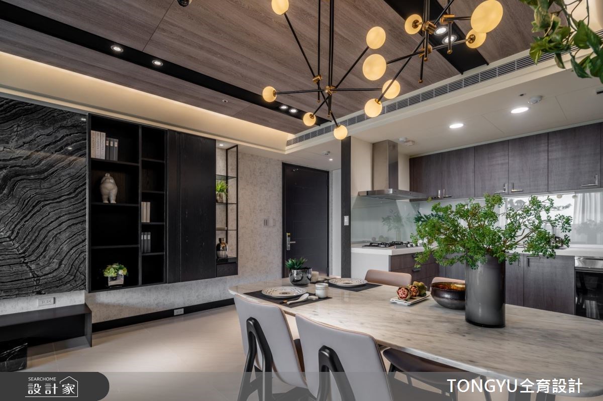忙碌的都會生活,心中渴望擁有一處能沉澱、滋養心靈的靜謐宅居。現在,以都會時尚做為設計靈感,擁有大面採光的優勢,室內裡搭佐自然質感的木紋、俐落線條的石材,創造出低調卻品位依舊的百坪豪宅。 整體以開放隔局為規劃,隨著戶外光源的引入,形塑開闊舒心之感。電視牆以漸層的灰階石材拼接而成,搭配素雅的布面沙發、圓形茶几,交織出內斂且非凡氣度;餐廚領域透過細緻的鏤空鐵件屏隔,隱喻空間劃分,黑色的中島與櫥櫃門片,展現沉穩風範;藉由暖調木紋鋪陳天花板,並以黑色溝縫的造型、嵌燈設計為照明,與深色廚具相互呼應,而原木質感的肌理延伸至餐廳區的壁面,同時成為共用衛浴的隱藏門,替冷調的現代空間挹注溫潤氣息;餐廳桌倚靠整片落地窗,接引敞朗天光,且讓戶外的植栽、卵石等景致引入,形塑內外皆景的人文雅緻豪邸。 小編的最愛 私領域持續以簡約的設計語彙打造,還創造一處寬敞的夢幻更衣室,開放展示的衣櫃收納,展現獨特的時尚品味。