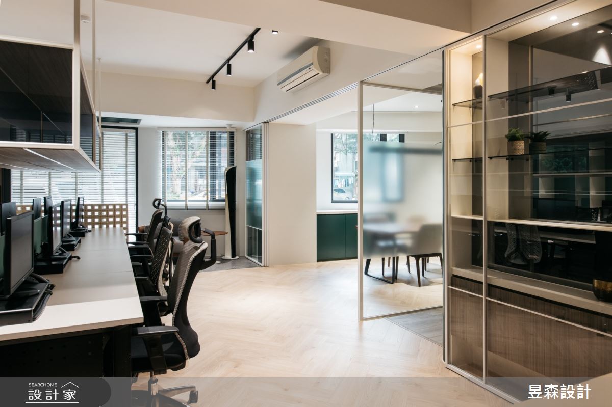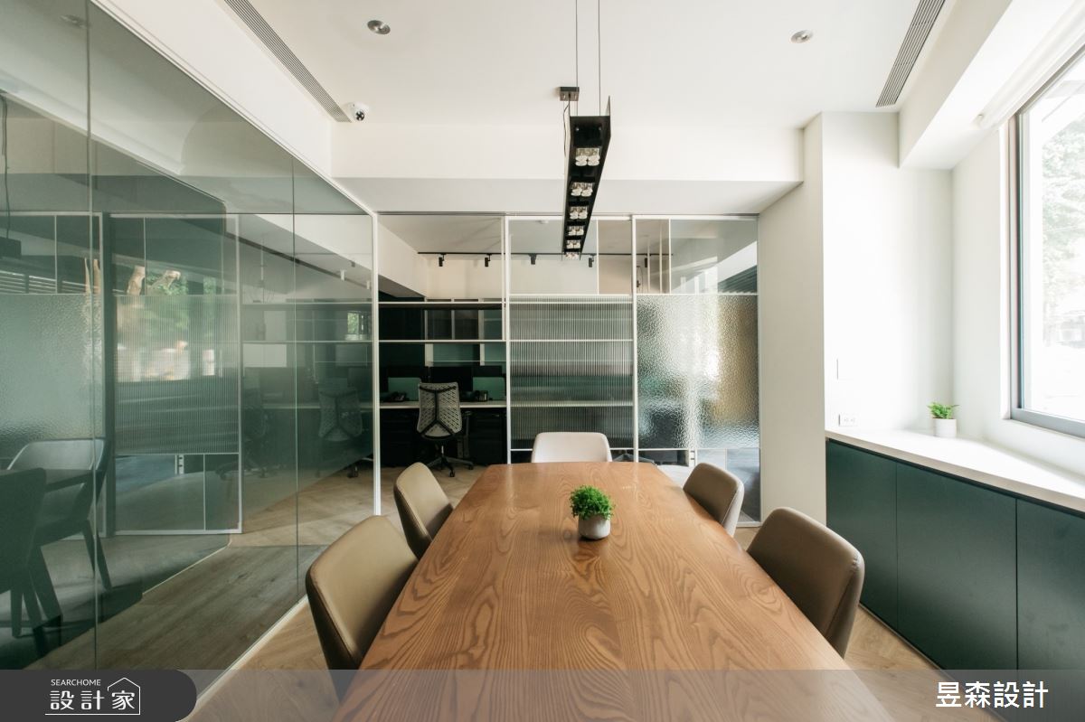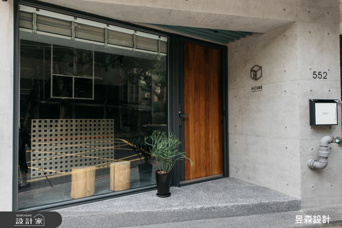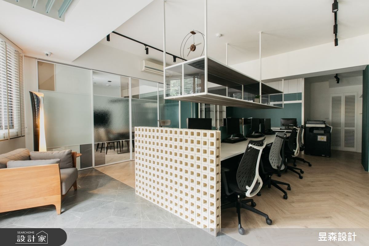昱森設計以鐵件、珪藻土、人字拼超耐磨木地板、義大利大板磚、礦物塗料的搭配應用,呈現簡約風的風格氣息,將此間32坪老屋(41~50年)優雅詮釋成舒適愜意的商業空間。