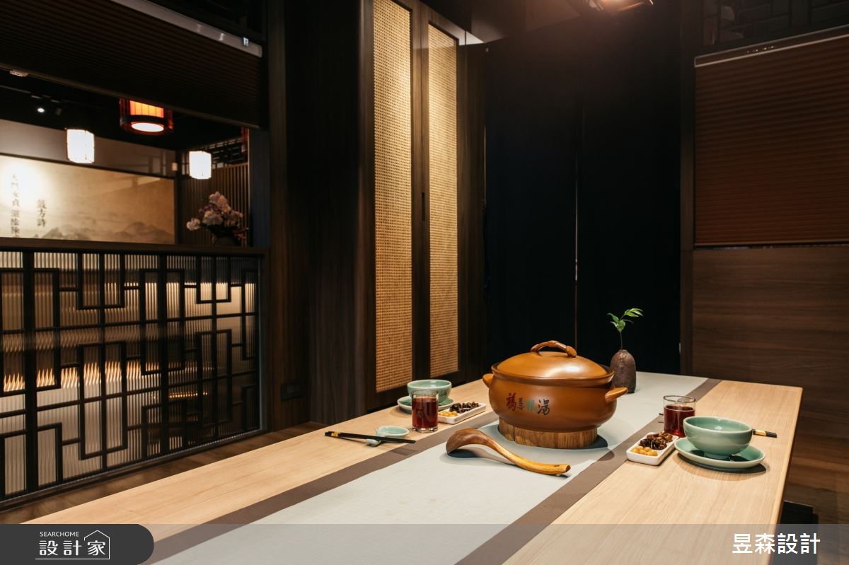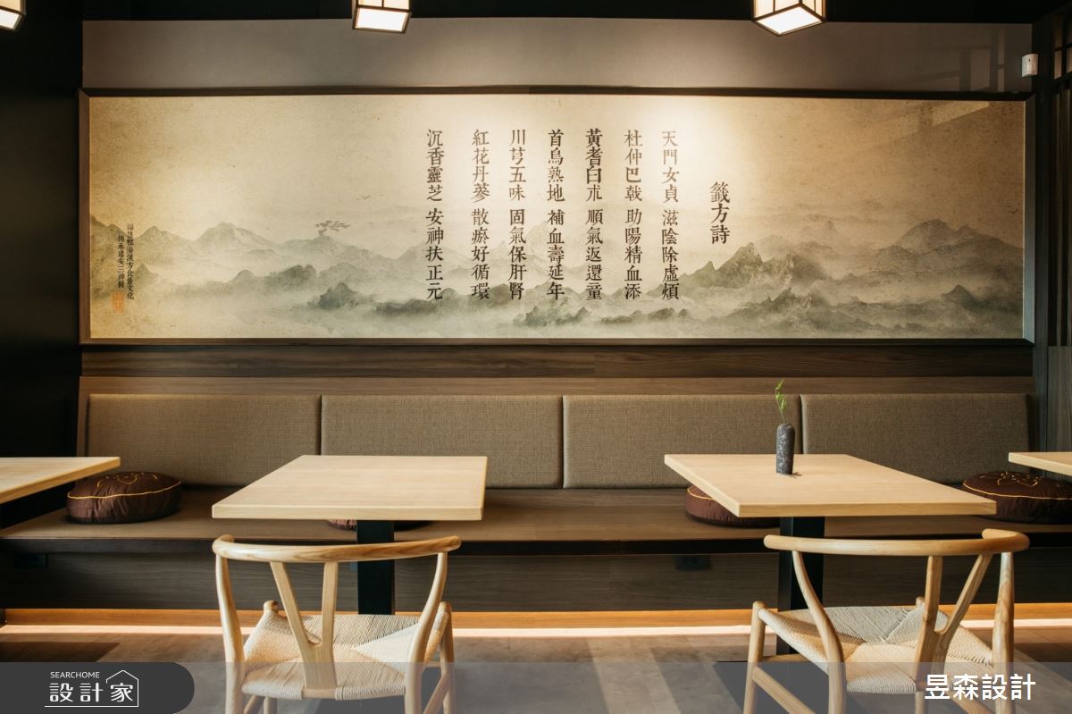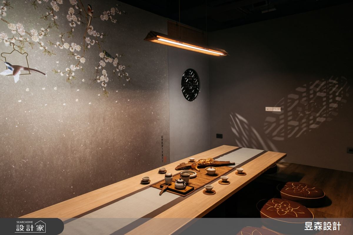 昱森設計以壁紙、大圖輸出、水泥漆、鐵件、灰鏡、鍍鈦金屬、木作貼皮、鋼刷木皮、軌道燈、繃布、SPC地板、闊石的搭配應用,呈現新中式風的風格氣息,將此間30坪中古屋(5~15年)優雅詮釋成舒適愜意的商業空間。