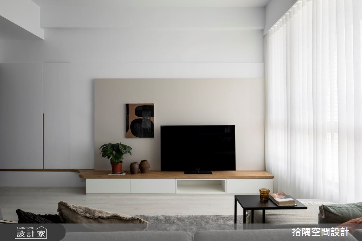 來自拾隅空間設計的21坪療癒風住宅案,是一間單層新成屋(5年以下)的兩房格局,設計師藉由建材以超耐磨木地板、鐵件、人造石、實木木皮、系統櫃、玻璃、塗料的搭配應用,實現一家人的理想生活。