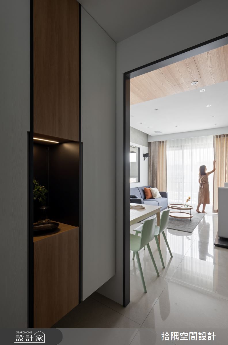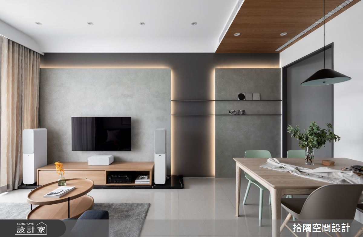 拾隅空間設計以大理石、仿清水模塗料、系統櫃、木皮的搭配應用,呈現混搭風居家氛圍,將此間20坪、兩房、單層、新成屋(5年以下)打造成舒適愜意的家庭空間,完成全家人的夢想之居。