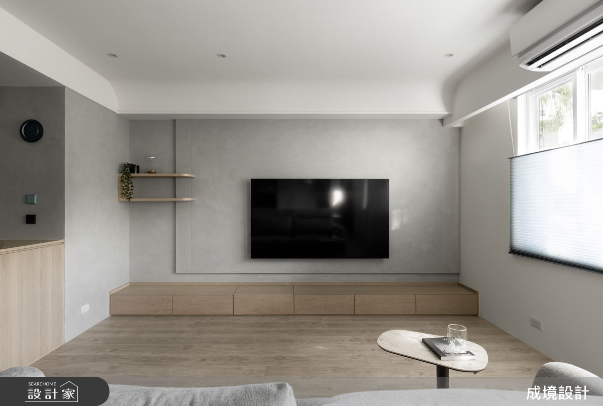 成境設計以超耐磨木地板、灰泥、長虹玻璃的搭配應用,呈現混搭風居家氛圍,將此間15坪、兩房、單層、新成屋(5年以下)打造成舒適愜意的家庭空間,完成2位大人全家人的夢想之居。