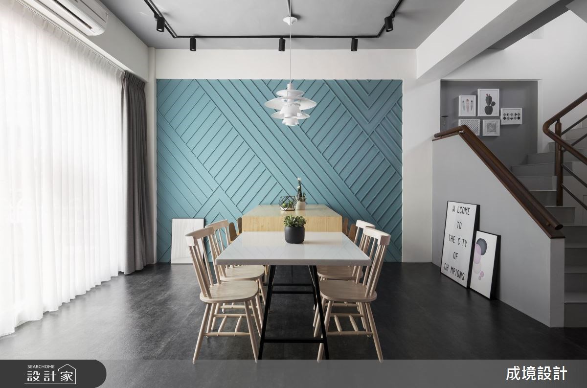 48 坪的北歐風民宿,為了打破一般人喜愛待在房間的居住習慣,用兩張大桌子和一張大中島,取代公共空間的傳統沙發佈置,營造能夠享用美食、玩場桌遊的趣味天地。 充沛的自然光打亮交誼廳的孔雀藍牆面,線條感十足的紋理,映襯出木質桌面的樸素,而地板的黑也與天花的灰,形成上下一致的沉著氣質。廚房區域用懸吊櫃擺放酒杯,住房的客人可以在色彩拼貼的吧檯,吃喝談心。一旁展示牆面,保持老屋的原始肌理,並透過三角形的幾何鐵件,增加空間的趣味性。 房間則藉由色彩搭配,呈現不同的視覺風格,像是利用鋼青色的線板牆面,打造優雅的美式風情,同時轉化壁爐形象,變成造型電視櫃。另外還有以粉黃藍色塊交疊的俏皮氣氛、蒂芬妮藍和斜面床頭牆結合的粉嫩調性,以及穠豔藍的藝術感受,不同的臥室分別對應不同的賓客個性。 小編的最愛 每一間房間都挑選色彩對應的圓點,在提供吊掛衣物功能的同時,也替繽紛的室內錦上添花。