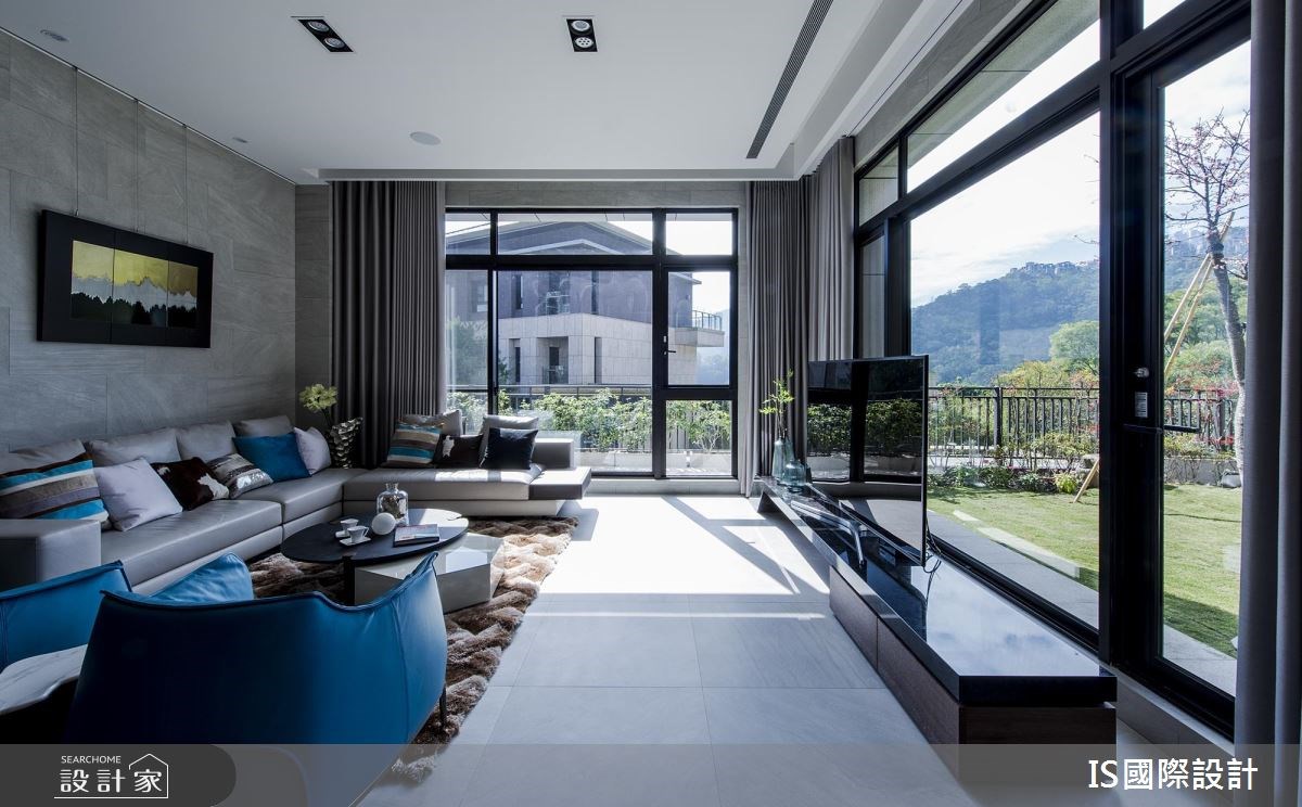 此案坐擁山林景緻,L型的落地窗設計延攬戶外風光,與室內蘊藏簡約、人文氣息的雅緻風格相互呼應,內外調和一片悠然氣度,療癒身心。 旋開大門走進室內,眼前以深色、粗獷紋理的石材飾底,搭佐金色流線型的雕塑品,一幅藝術端景映入眼簾,感受雅緻的人文品位。寬敞的空間裡以開放格局做為規劃,利用絕佳的比例安排,讓各個領域被充分運用。客廳空間裡,沒有制式化的電視牆設計,僅透過大面玻璃質材為隔間牆,電視簡單擺設在矮櫃上,可依需求做調整;沙發背牆以義大利進口高級石英磚舖陳,淡雅色系與紋理交織的底牆上掛上一幅木作邊框的山水畫作,室內外風光就此相融、延續;沙發背牆銜接深色的梧桐木壁面,一個轉角經過廊道上的端景,來到開放的餐廚區,讓鑲嵌玻璃爐的黑色中島為軸心,中島兼具吧檯機能,可容納10人左右,周圍則以大地色系的收納櫃為主,拉高櫃體的手法更延伸視覺,讓視覺美感與實用機能兼備。 小編的最愛 在視聽室裡特別利用仿石紋的霧面進口磚作為壁面造型,淡雅灰色系與空間裡的歐風沙發相互搭配,型塑靜謐非凡的氛圍。