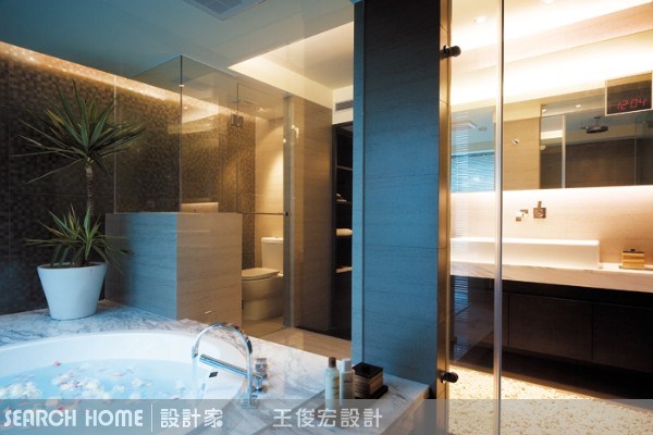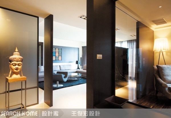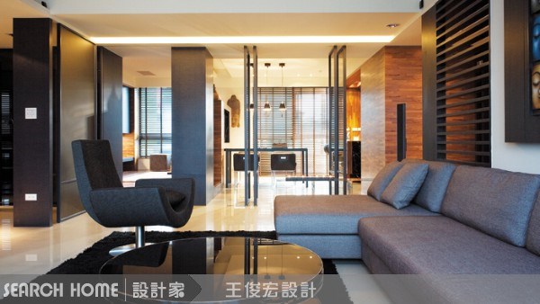 從玄關進門,左邊是細框霧面屏障,右邊是有彈性拉門的書房,招待客人品茶和室,液晶電視可以翻轉,落地窗以同等長度的木百葉塑造整面質感。要享受視聽的時候,客餐廳之間的清玻璃拉門就可以闔上。主臥床頭板的仿鱷魚皮繃布,緊繃著一塊一塊長型的夾板,再由兩