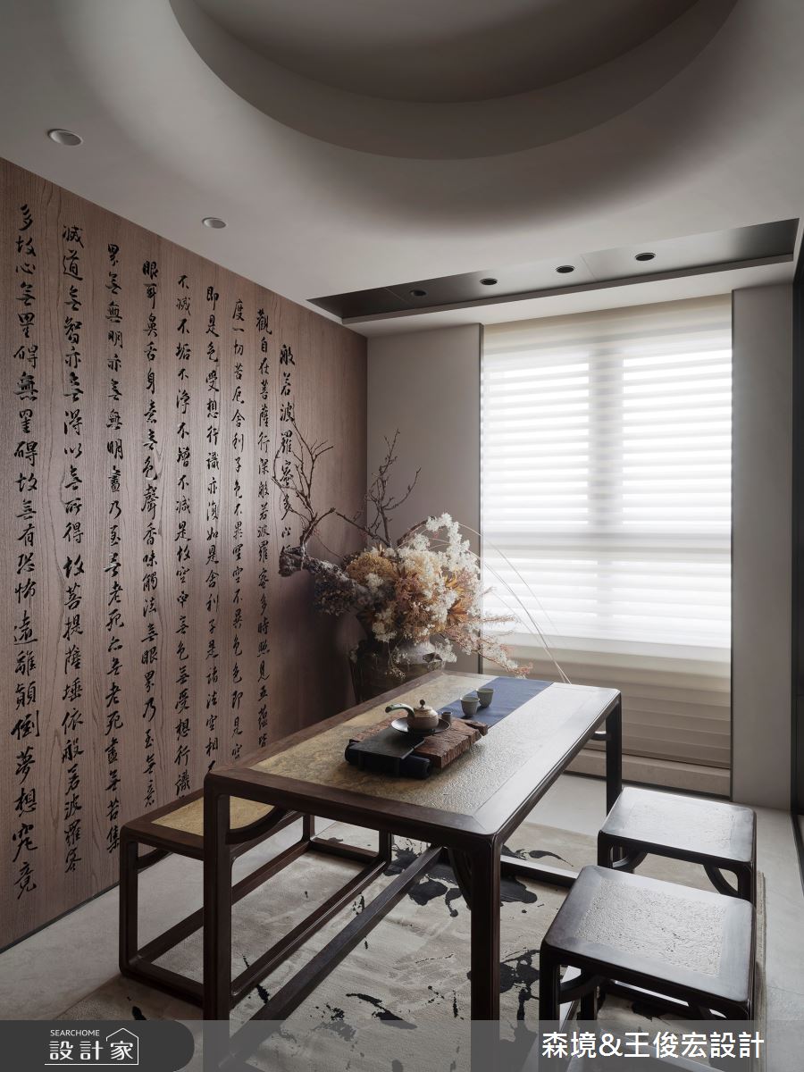 森境+王俊宏設計以岩板、鋼刷木皮、實木地板的搭配應用,呈現人文禪風的風格氣息,將此間1059坪新成屋(5年以下)優雅詮釋成舒適愜意的商業空間。