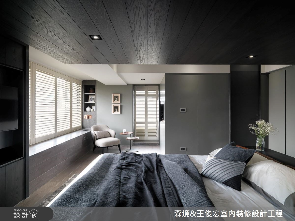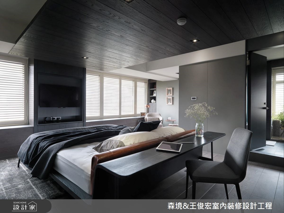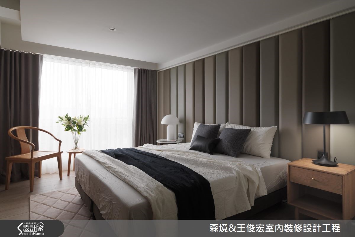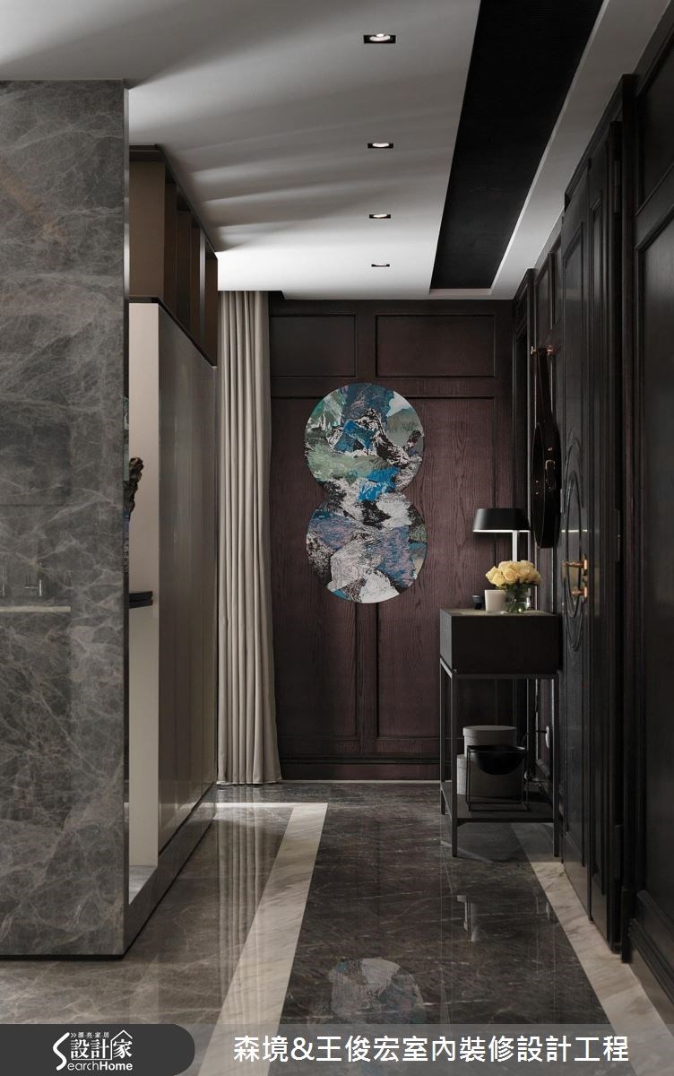 雖然擁有寬敞的坪數和8 米的空間縱深,這處三代同堂的 90 坪宅邸,卻缺乏合宜的動線層次,原有的裝潢設計也過於華麗輝煌,無法展現相匹的大方氣度;在本次裝修設計中,設計師既增加了內外的格局層次,也重新調配色彩調性,彰顯雍容而大器的現代豪宅氣場。 卸除過於華麗的壁紙和裝飾,將原本的大理石牆稍以延伸,對稱兩側分別作為電視牆和展示櫃體用途,透過局部的鏤空,保留公領域的敞朗光度,中段則成為大宅中氣派的拱門入口,也自然區隔出玄關和公領域的內外層次。天花處利用潤和的流線造型包覆樑體,邊緣飾以銅金色框構,營造低調隱約的奢華質感,並向兩側衍伸為客廳與餐廚區域,使空間縱深段落具有合宜的段落區分。佈置搭配部分,則選用簡約時尚的義大利品牌家具,餐區以一張大圓桌象徵東方的「團圓」意涵,輔以內斂溫潤的中性色調和藝品畫作,勾勒出大宅空間的美學印象。 小編的最愛 臥室運用黑色木飾面隱藏私領域的入口動線,以沉靜溫潤的大地色系為基底,並加強了整體收納機能,展現簡約舒適的空間質感。
