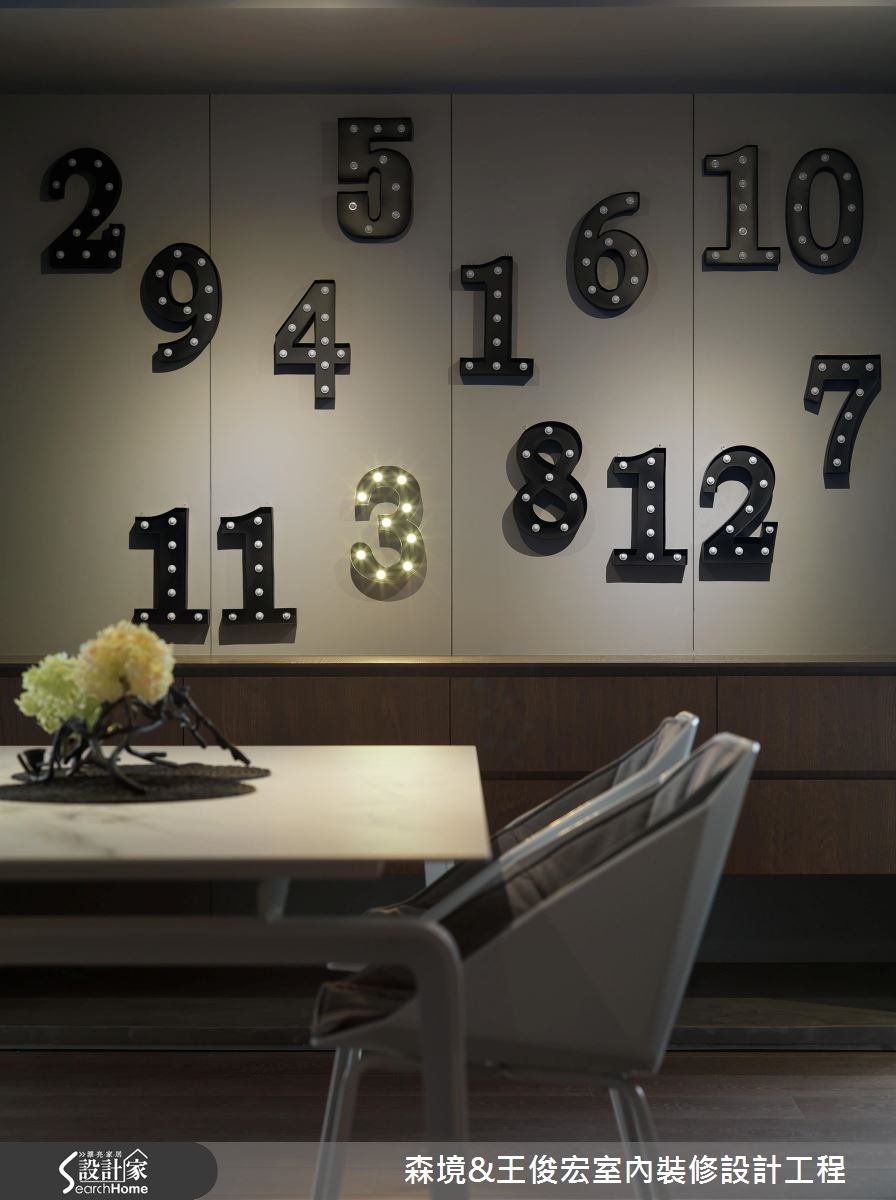 來自香港的頂客夫妻愛上台灣南方的人文風情,決定購置當地一間中古屋,作為來台時的居所,設計團隊成功克服跨海溝通難題,讓夢想中的度假屋得以順利成形。 設計團隊接手二度裝修的中古屋,從拆除階段開始改造,玄關處以磐多磨形塑圓弧造型,並抹除過多色彩,讓全室的灰階色調營造冷靜、大方的氣息。不規則排列的格柵屏隔成為內外地坪的另類分界,為空間增添豐富的光影表情。破除原先零碎的廳房格局,公領域採用全開放設計,採用線條俐落的無色彩家具單品,精準詮釋夫妻的時尚品味;另外採用延伸至天花的溫潤木質電視主牆,避免過於冷冽的感受。用餐空間成為客廳與餐廳的鏈結,結合中島吧台,創造更富有互動性的歡聚空間。主臥兼具書房機能,除了收納與休息的基本設施,更將梳妝台結合書桌,讓夫妻的互動度提升。 小編的最愛 餐廳牆上的 12 個發光的數字破除一般對時鐘的制式印象,沒有精細的時間區分,填補期間的是隨性與悠閒,更多了宛如好來塢的時尚氛圍。