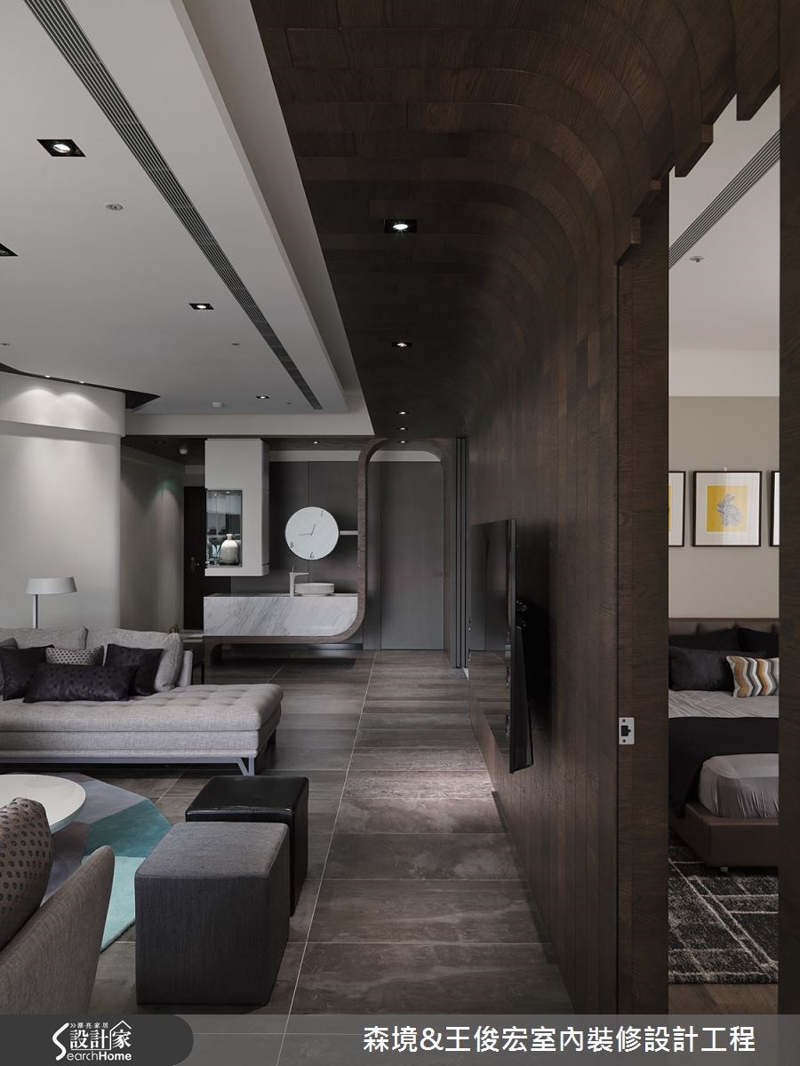 擅於拼布手工藝的女主人,希望能擁有專屬個人的品味空間,於是在王俊宏設計團隊的引領下,於 50 坪空間內帶出曲徑通幽的空間意境,同時挹注機能、風格與美感等,使整體設計渾然天成,徹底實現女主人夢寐以求的理想住宅,讓居住者的生活美學自然流露! 入門處規劃蜿蜒過道,給予由窄入寬的動線鋪陳,一旁則結合展示、空間區隔、盥洗等多元機能,穿越此區域後,即衍生柳暗花明的開闊視覺效果;電視牆採以深色木質作出曲線造型,連結立面與天花板,藉此貫穿廊道縱軸動線,並與玄關區立面造型相互呼應;且於廚房配置大面玻璃拉門,替長廊引光,同時達到隔絕油煙效果,當門片敞開,餐廚區隨即和客廳彼此串聯,放大場域尺度;臥房則加入曲線造型天花板,以此修飾結構樑,同時讓電視牆兼具隔間、收納、展示等多重機能,滿足起居需求,以一物多用設計來放大空間坪效! 小編的最愛 設計師將採光最佳場域留給工作室,替女主人打造一目了然的收納、展示櫃,讓布料、縫線等材料形同空間裝飾,帶出美學品味!