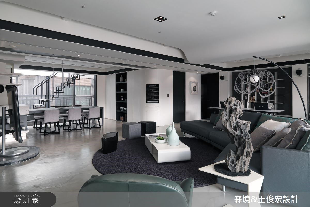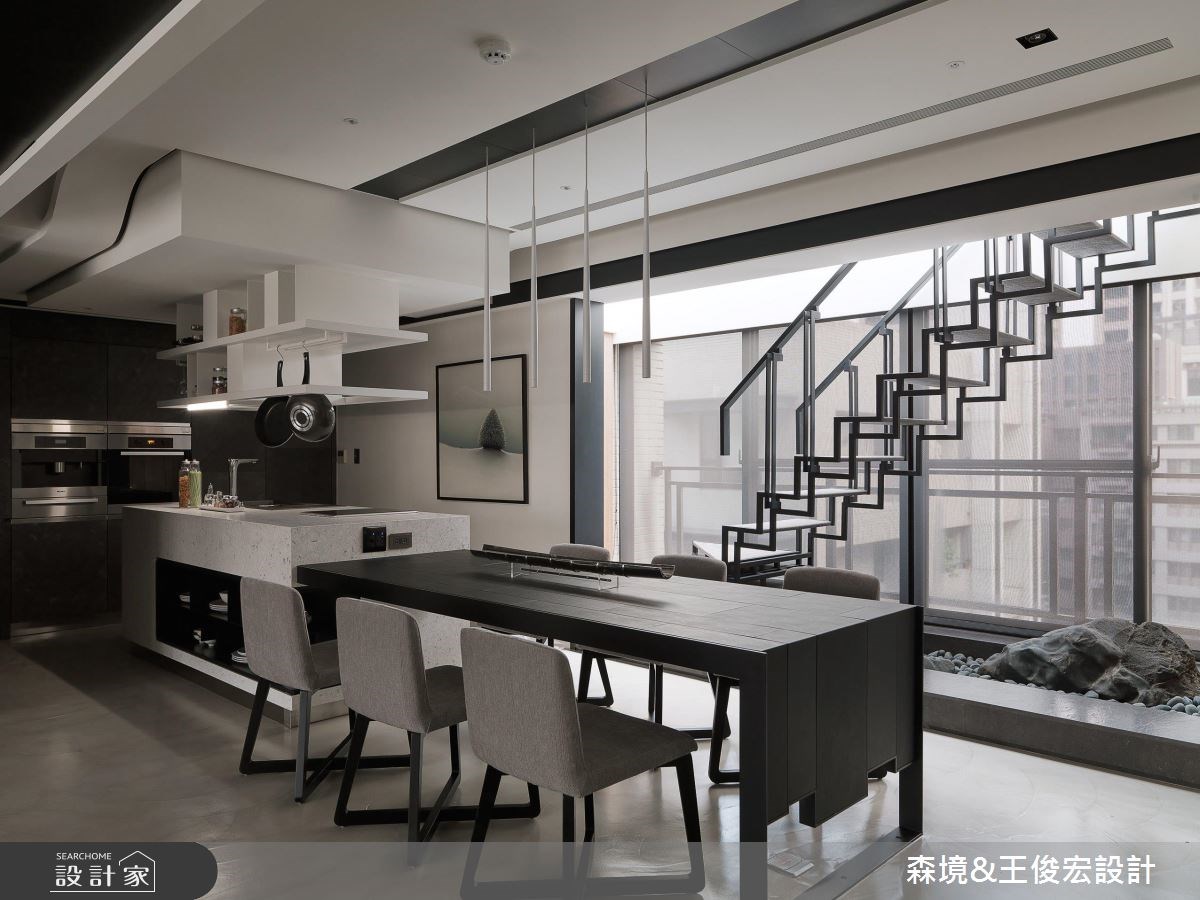 長年生活在國外的屋主,對於居家生活品味非常講究,因此希望在台灣也能打造一處專屬自己的風格家屋;而擁有設計魂的屋主,找上同樣專注細節設計的王俊宏設計師,兩人經過不斷的討論,靈感激盪下,最終以時尚現代風作為呈現,並強化廚房內所有設計細節,打造內外兼備的紳士私宅。 空間擁有大面採光的優勢,為了解決單面樓梯量體擋住光線的問題,將樓梯的RC材質變成輕量化鐵件,創造出輕盈無壓的視覺造型,同時讓光可以大量走入室內。玄關天花板以波浪狀設計延伸入室,修飾與美化空間大樑結構,呈現出大器姿態;考量空間裡沒有獨立的牆面,因此弱化電視牆體,僅擺放在空間的角落,隨之以45度角的沙發配置,且延伸後方的書房與臥榻閱讀區,串連整個公領域的動線安排;開放書房特別創造弧線形展示造型書架,層板框構出各種尺寸的面積,可容納小說、漫畫與雜誌等各種尺寸書籍,波浪狀的線條延伸至點線面元素構成的天花板,造型風格一氣呵成! 小編的最愛 屋主非常講究廚房設計細節,以大面拓彩岩鋪陳主牆面,視覺產生流暢、寬敞大器之感;進口設備結合專屬設計的櫃體,再搭配俐落時尚感的不銹鋼電器,量身訂製專屬紳士的廚房領域。