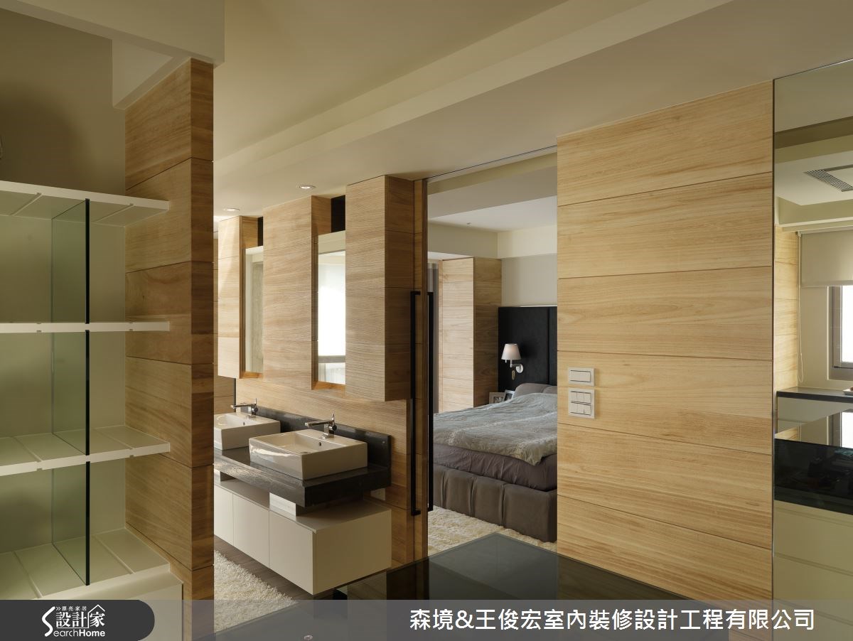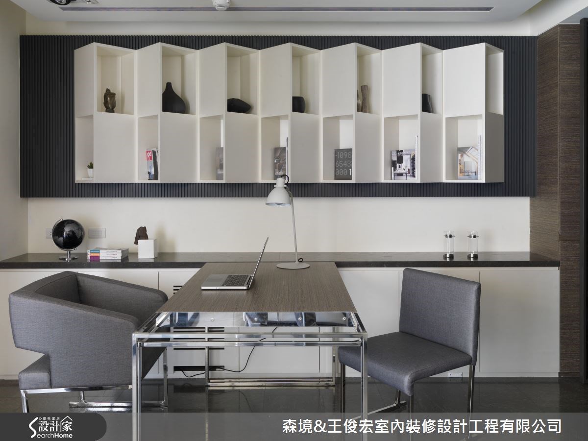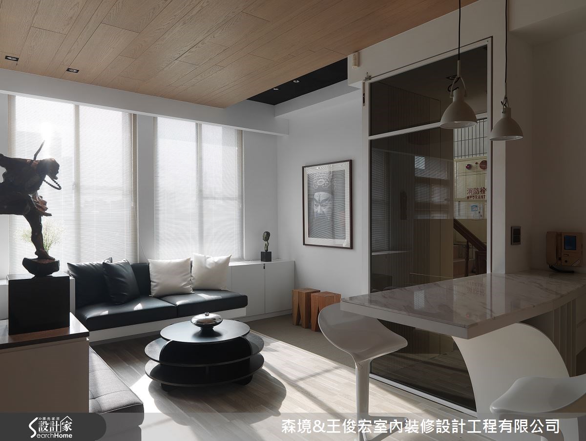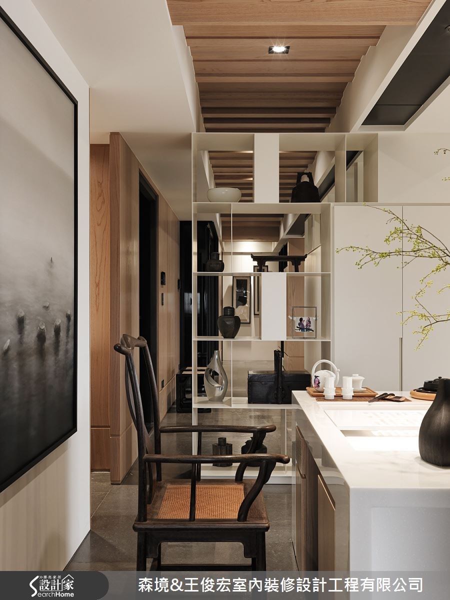 新舊並陳、創意巧思,整體空間除了現代簡約的風格外,還注入更深層的人文精神,融合東、西文化精髓,演變出獨創一格的新氣象。將出入口設於長型格局中段,摒棄一般玄關設計手法,採具穿透感的玄關櫃兼電視牆區隔,讓入口成為通往家中各區域的樞紐,左轉即為主臥,右轉則是廚房,向前走即進入公共區域。公共區劃分為女主人畫室、客廳、男主人泡茶區三個使用區段。因為男主人經常在泡茶區接待客人,於是此區與客廳之間採開放式設計,僅女主人畫室設置隱藏式拉門做出空間區隔。偌大的電視櫃如積木的堆疊,卻以線條俐落的白色鐵件建構而成,減輕壓迫感。過道區用黑色石材與公共區劃分出隱性空間界定。壁面採用溫潤的木皮鋪陳,讓空間變得更加溫馨。另外屋主原本就有泡茶的雅興,特別以人造石訂製泡茶桌,搭配中式官帽椅做為主人椅。壁面懸掛帶有水墨畫效果的現代畫作,而前方量身訂製的實木桌,則刻意做出曲線內凹效果,恰可放置茶盤,或隨興搭配水生植物造景,也別有一番風情。主要建材:鐵件、石材、噴漆、木皮。裝修費用:500萬以上。
