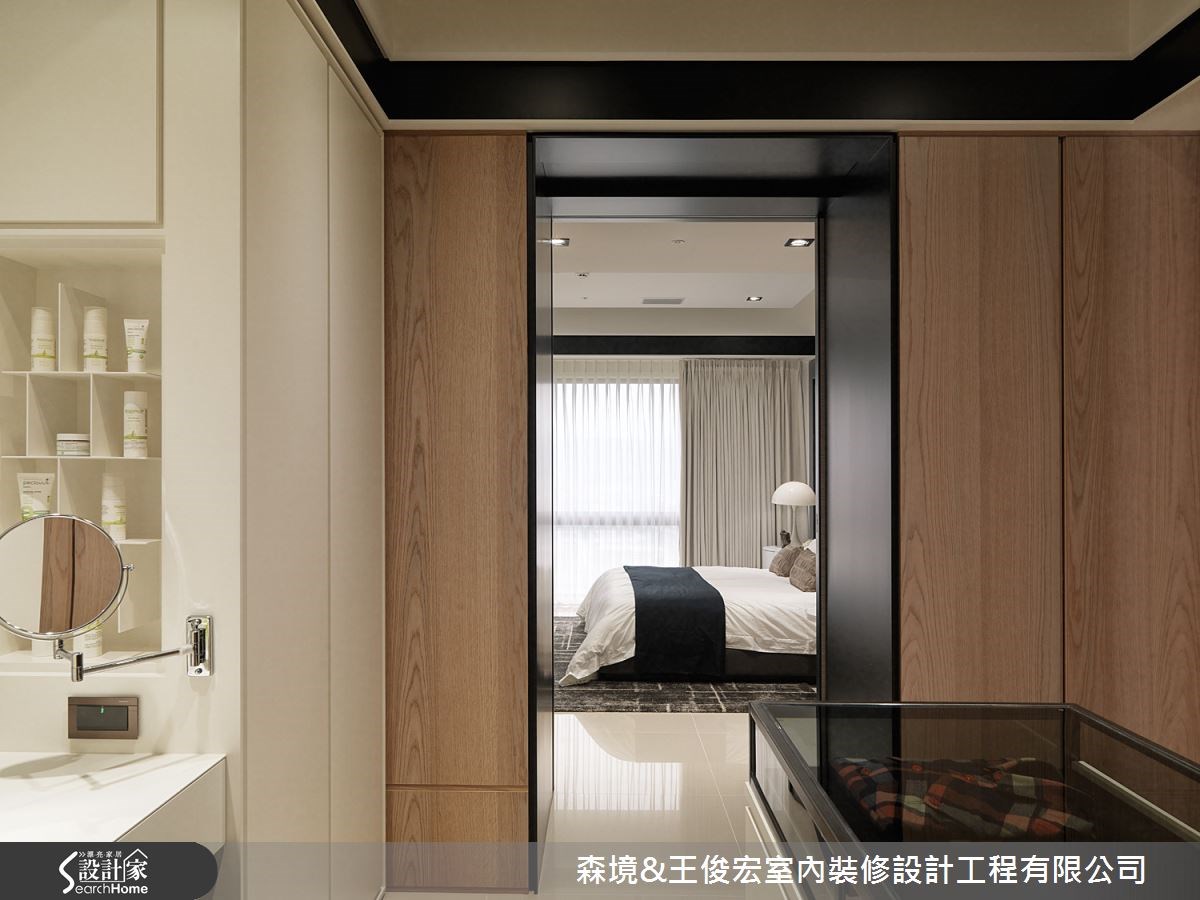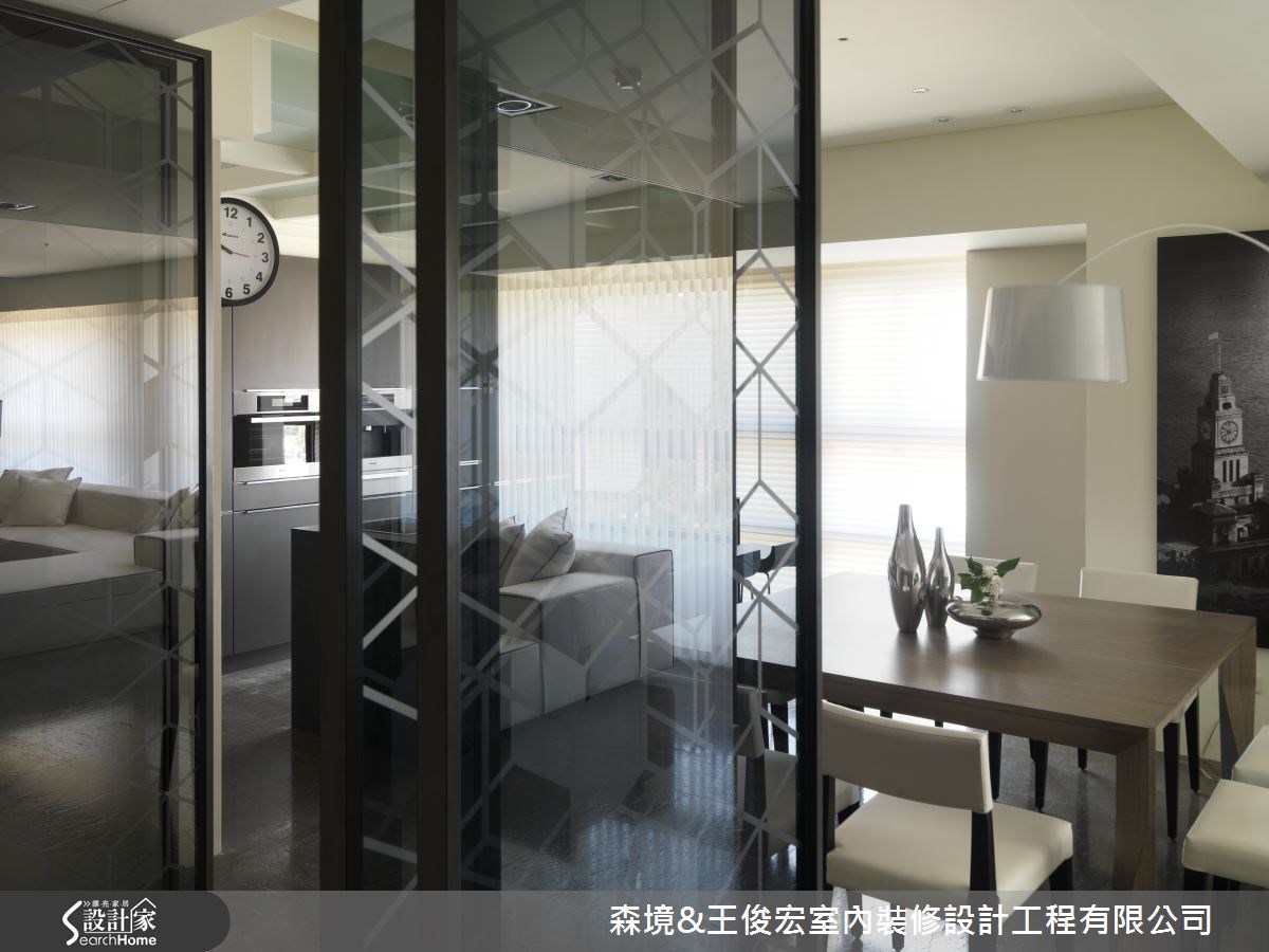 <場所精神>本案受風格派當中被立體主義影響最深的Theo van Doesburg的設計思維引導,將斜角角度經由線面的擴張,轉化成有調性的旋律,運用幾何造型的規律及秩序性,呈現等量分割的表情,整體設計從不規則的方塊型酒櫃開始延伸。相仿的語彙出落在客廳主牆面石材切割拼貼的背景、客廳與餐廳、餐廳與走道、走道左右各自底端由皮革切割繃製而成的端景牆面、客廳與書房之間摺疊門扉上的噴紗圖騰,從線、面、發展至於立體,筆直而流暢的線條,經由斜裁產生不對稱的魅力效果,串聯出空間曠達的氣勢。主要建材:超耐磨地板、茶色玻璃、木皮、石材。