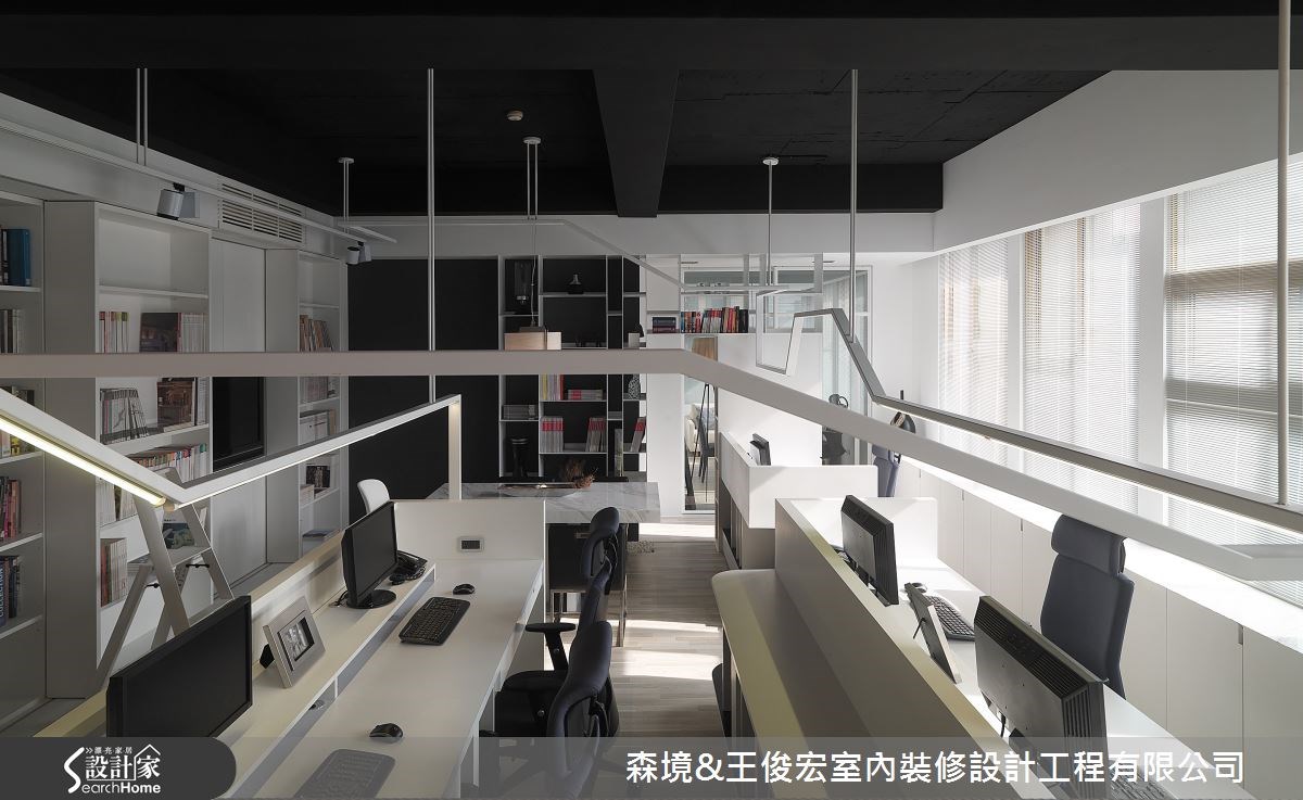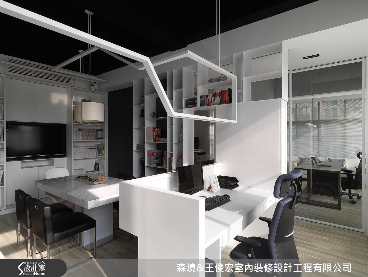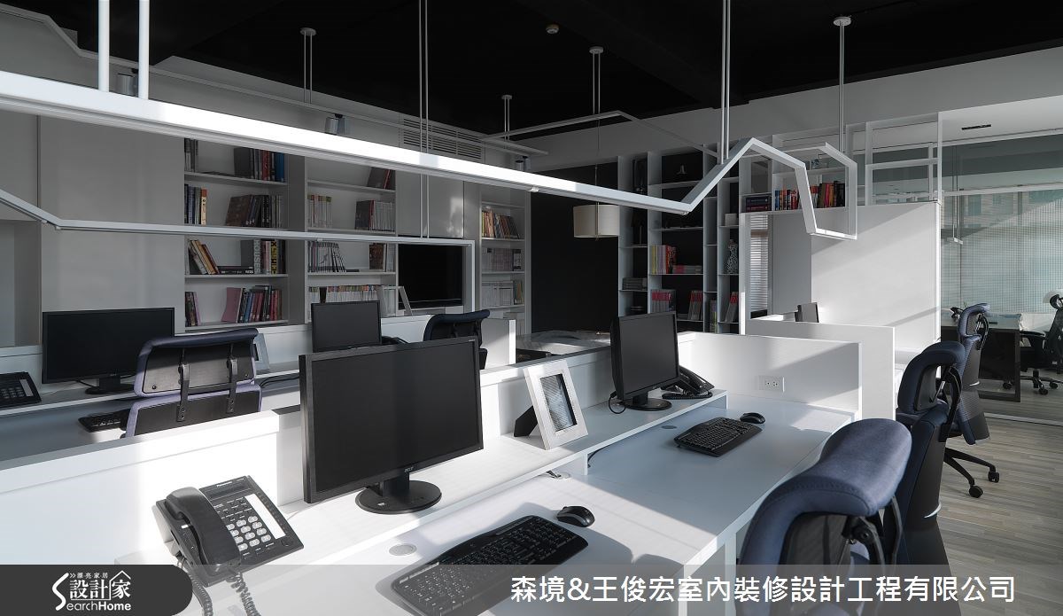 本案是王俊宏設計師新完工的辦公室,室內區隔接待區與辦公區的櫃面材質,為塑料材質的波龍地毯,仿毛料編織布紋的設計,讓來訪的客人一進入接待區,就能感受到溫和內斂的人文氣息。特別的是,設計師打破燈光既定的運用形式,以白色鋼管結合LED燈的設計,順