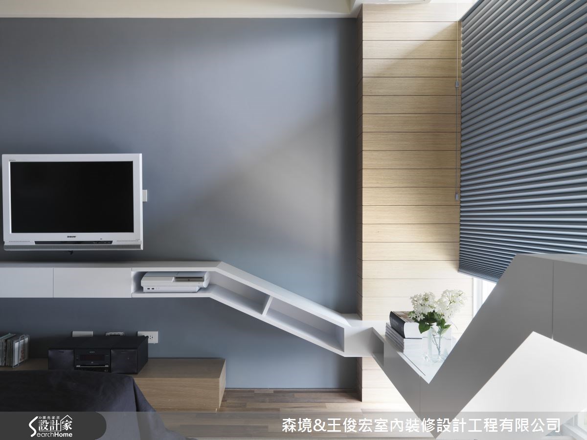 屋主夫妻是提琴演奏家,因此王俊宏在設計上也發揮巧思,客廳與電視之間不再是對望的,而是擺在沙發一側,甚至如同家具擺飾,這樣的配置方式透露出屋主的the way it is,他並不受電視束縛,休閒時間可能是與訪友聊天、閱讀、聽音樂等,這樣的配置