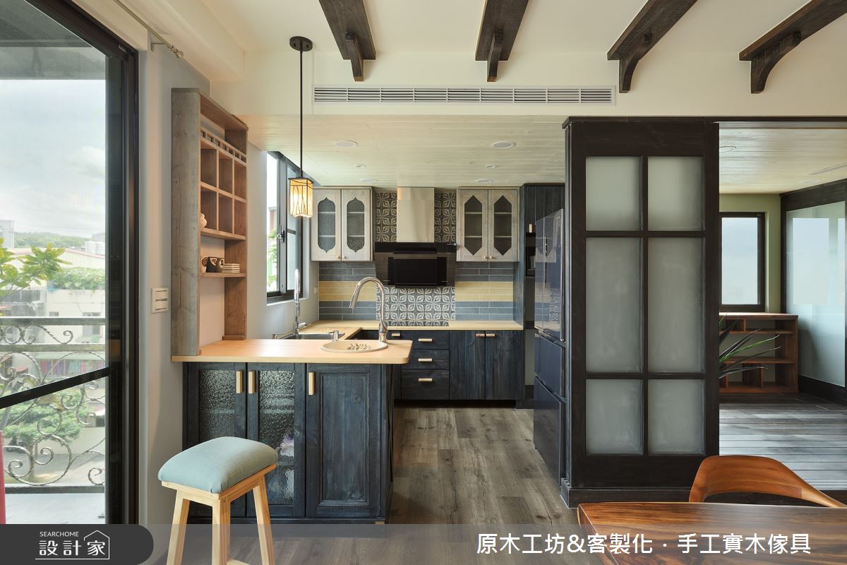 屋主喜愛原木的質感,加上裝修期間面臨女屋主懷孕,因此希望全家人能生活在健康無毒的家屋裡。李佳鈺設計師以濃濃歐式鄉村風做為基調,利用原木家具的設計巧思,像是餐櫃獨特的門片設計,美化整體家的氛圍,讓多年老屋重獲嶄新生命! 整體格局變動上,由於屋主需經常使用廚房,為了呈現出開放式視覺,且烹調時能杜絕惱人的油煙問題,於是將封閉的廚房拆除隔間牆,換上原木質感拉門,當需要呈現出開放空間時,門片可收到兩側,非常方便;另外主臥衛浴的空間太小,將局部牆面拆除、挪用部分主臥空間且以原木隔間,成功加大衛浴領域。客廳裡,以原木斜屋頂的概念打造天花板,大面的拱形落地門界定戶外陽台區,牆面結合老磚牆的復古味道,呼應歐式主題風格;電視牆結合訂做家具概念的巧思,以花磚飾底,展現獨特味道;廚房裡盪漾著歐式鄉村風,透過深藍色打造中島、櫥櫃與展示櫃,展現獨有性格;開放式書房裡,以原木材質打造L型書桌,下方納入書櫃設計,讓機能與美感完美相融! 小編的最愛 空間裡也非常重視收納機能,從玄關開始的鞋櫃、電視牆,到餐廚空間的餐櫃兼書櫃設計,轉角空間還特別打造一個小儲藏室,希望能滿足一家三口的生活質感。
