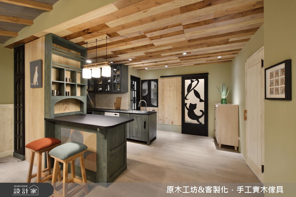 來自原木工坊&客製木傢具的45坪鄉村風住宅案,屋主一家人共有2位大人、2位小孩,是一間單層新成屋(5年以下)的三房格局,設計師藉由建材以油漆、花磚、鐵件、磁磚、軌道燈、原木、黑板的搭配應用,實現一家人的理想生活。