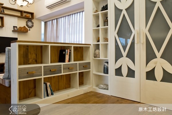 此案為19坪的樓中樓老屋,原室內採光不足、較顯壓迫,經設計師保留公領域的挑高空間,微調夾層結構,並重整格局,再以自然的原木質感鋪設整體氛圍,隨著光線的引入、色彩流淌一室,營造出溫潤氣息的鄉村風新婚宅。 花磚鋪設玄關地坪,一旁的原木鞋櫃搭佐特殊造型的立面,展現動人的異國風情。淺色原木成為公領域的地坪風貌,挑高的落地窗引入戶外光線,照亮空間裡原木的質感與細節設計,沙發背牆飾以綠色,與階梯、壁面層板的色系相互呼應,展現活潑的自然氛圍;磚牆打造電視牆,展現出樸質復古味,而為了讓在客廳的家人可以享受絕佳的觀看視線,電視偏牆體左側並以懸掛式安排;空間裡的夾層以原木質感設計,消弭壓迫感受,廚房裡也以原木打造中島造型,醞釀濃濃的鄉村風尚;收納是空間裡一大設計重點,利用梯下空間納入大量的收納櫃,包含樓梯的踏階都以掀蓋式隱藏收納機能。 小編的最愛 讓樓梯成為領域的分野且導引出流暢動線,背對客廳的另一側為開放式書房與餐廚空間,淺色原木的鋪陳,加上客製化的家具造型,強化機能的同時更營造出藝術美學之美。