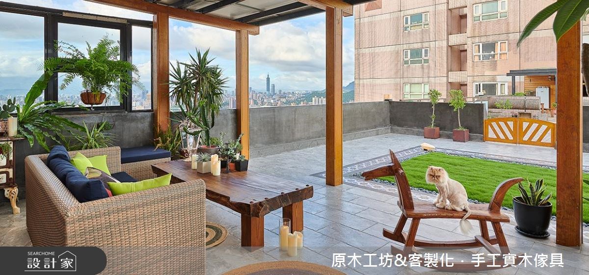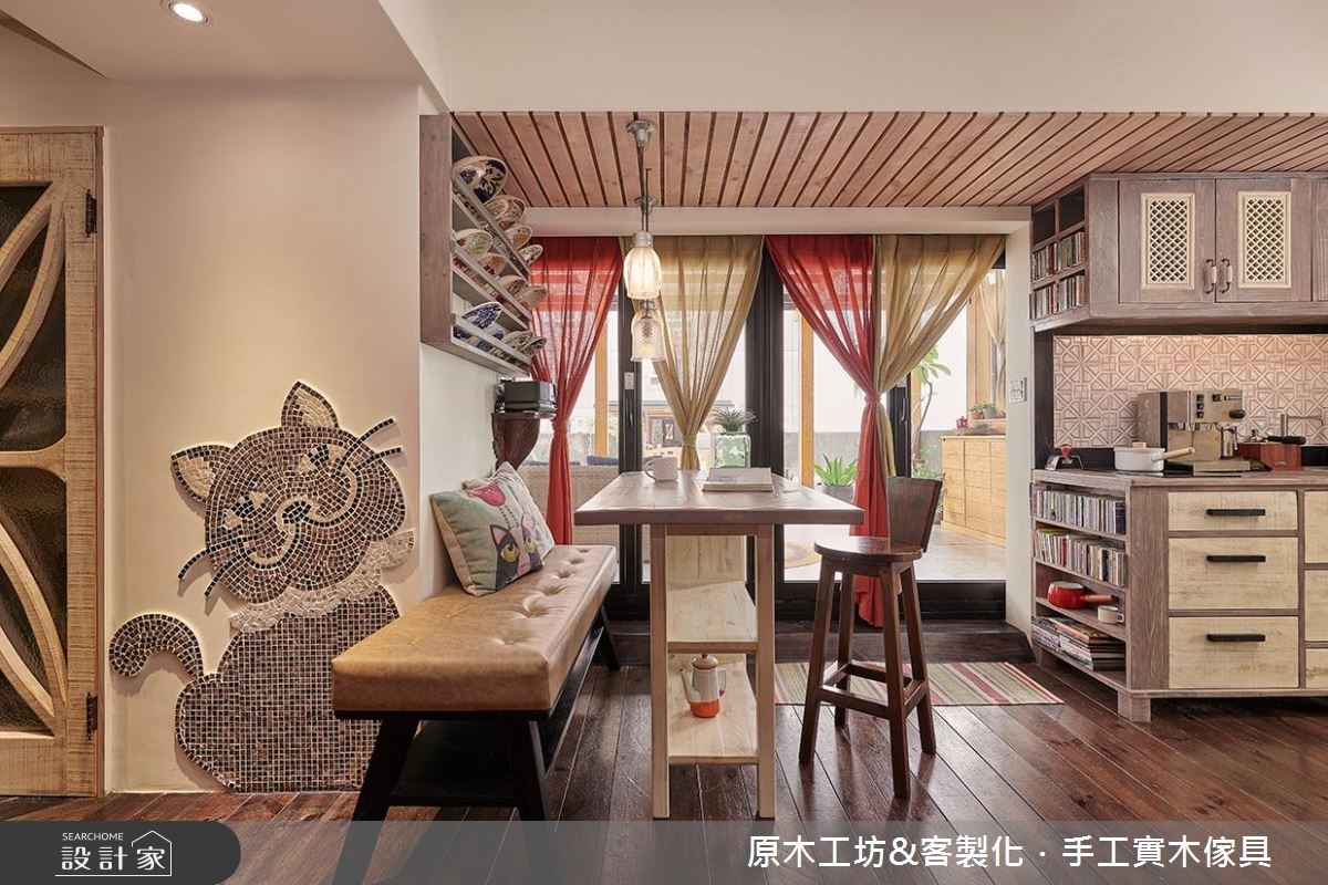 此案為設計師的家,是經歷20年歲月的老屋,依循原本明亮的採光空間,透過自然質感的原木元素妝點一室,混搭多源靈感的特性,調和鄉村風與休閒感的愜意氛圍,並彰顯屋主獨特的性格與思維,展現家的高度包容性。 原本戶外沒有露臺,設計師特別予以重整,換上地磚、搭建太陽能板後,不僅環保省電,更讓人走向戶外,體驗愜意的休閒生活。狹小的玄關,左側打造鞋櫃與穿衣鏡,右側以淺色原木襯底,懸掛設計師收藏的老鎖頭,挹注復古樸質味;轉個彎來到公領域,深藍色調的壁面替空間定調,L型沙發圍塑出客廳區,沙發下方納入造型收納,創造高度的生活機能;天花板的大樑懸掛以鐵件與原木搭配的吊櫃,櫃體下方做為燈箱,上方則可擺設綠意植栽,實踐一物兩用的細節設計;牆面讓不規則的原木表框裝飾,電視牆結合收納展示機能,讓空間增添變化與活潑度;開放書房以大型原木桌擺設,滿足設計師辦公、畫圖的需求,且將自身創作的畫妝點於壁面,醞釀藝術人文美學的色彩;餐廳以吧檯形式展現,落地窗迎向露臺,引入充沛光源,牆面陳列一排手繪餐瓷,洋溢著動人的異國風情。 小編的最愛 餐廳到儲藏間的壁面轉角,以馬賽克磚拼出設計師養的貓咪圖騰,充滿趣味與溫暖;而儲藏間的門特別以原木設計出獨特造型,下方安排一道貓門,讓貓咪可以自在的進出使用貓砂盆。