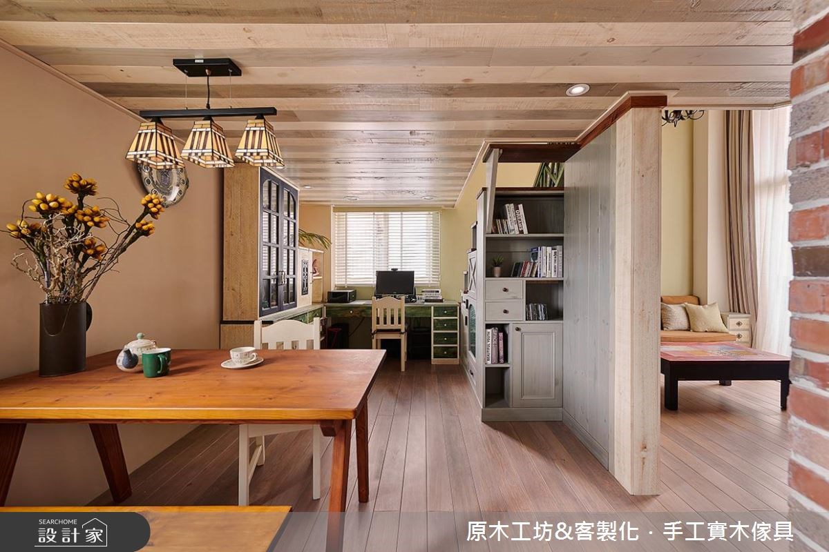 走過多年、35坪老屋裡,因濕氣重導致壁癌問題,挑高的樓層位子將入口光線遮蔽,造成室內陰暗;加上收納不足,許多生活物件散落在地板上。除了基礎工程的整頓,透過原木材質予以改造,透過鄉村風營造出溫馨的家屋氛圍,讓人愛上回家的感覺。 玄關地坪透過兩種磁磚拼接出獨特風情,且以鞋櫃作為內外界定。將空間裡的挑高位子重整,挪動至客廳位子,享受迎窗的明亮光感,視野也隨之開闊;整體空間透過環保的實木建材為主,降低空間裡的濕氣,同時營造出溫暖的生活感受;電視牆以木紋為基底,兩側搭佐水泥牆,讓造型簡單、自然,上方結合收納展示機能,滿足屋主實用的生活需求,右側則藉由花磚,界定出場域分別。因宗教信仰,需將佛桌納入整體設計,於是利用原木重新訂製,創造出簡約、乾淨的佛桌美感,迎窗的安排同時滿足風水考量,也融入整體家屋氣息。 小編的最愛 餐廚空間的天花板特別利用原木鋪陳,不僅呼應整體空間造型,調節濕氣,更減少壓迫感;而透過壁面的展示櫃設計,讓屋主喜歡收藏咖啡杯得以陳列,創造出空間的美學層次。