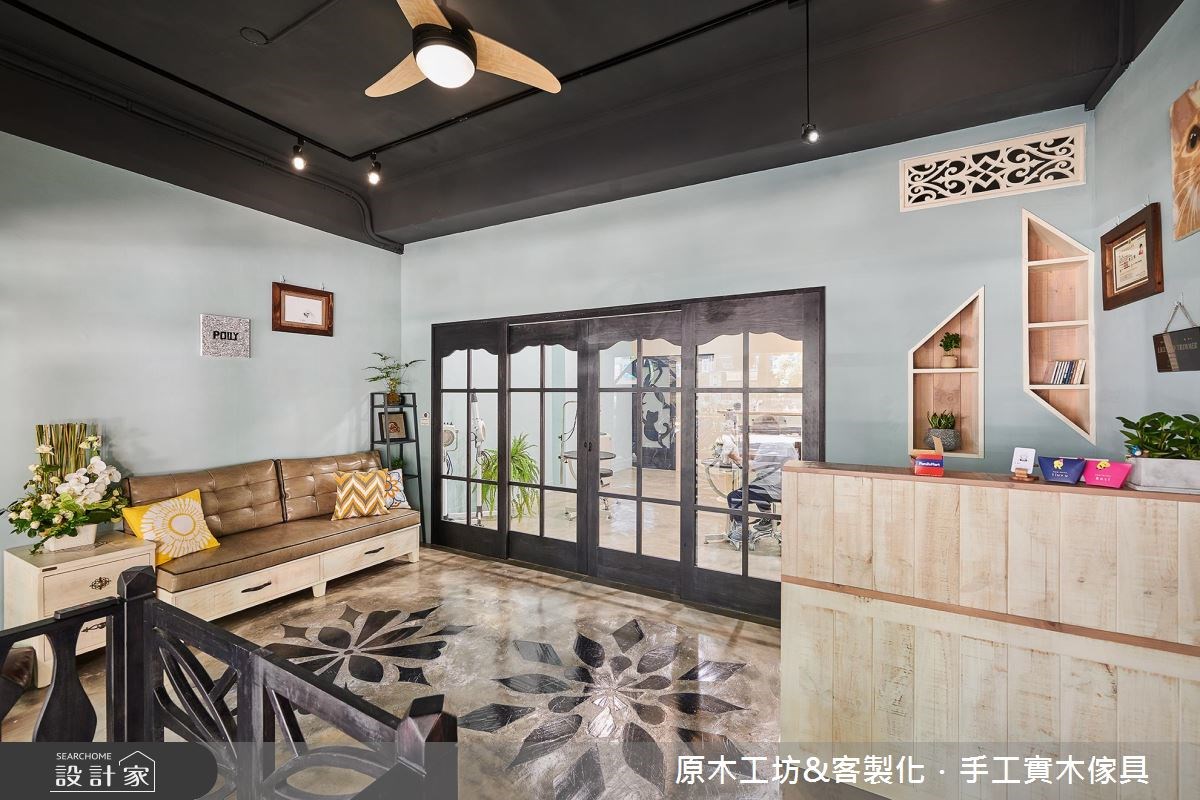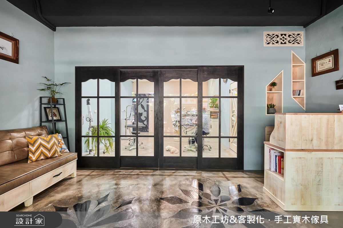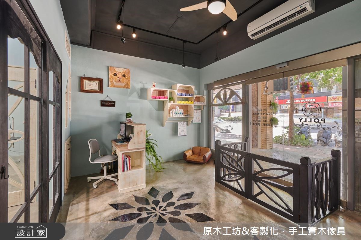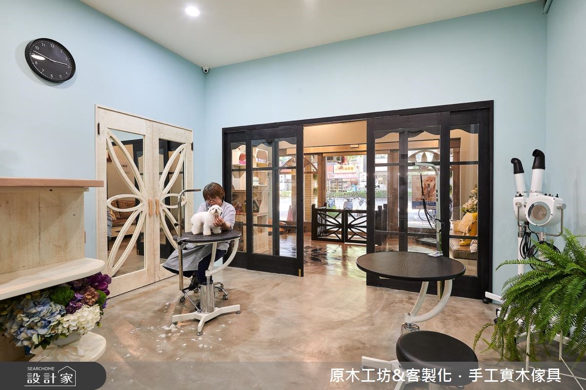為了帶給毛小孩們一個健康、無毒且溫馨的美容環境,藉由原木雕花語彙妝點一室,淺藍色調的壁面與開放層板的規劃,營造滿室活潑、愜意的鄉村風尚,讓到訪的客人也沉浸在悠然的氛圍裡,感到非常放鬆。 大門口以漆上黑色的木作安全門圍塑,有效防止毛小孩跑到戶外,兩側玻璃櫥窗搭佐對稱的門拱原木造型,呼應鄉村風元素,玻璃質感的隔間手法,讓戶外的光線能夠延伸入室,更顯潔淨明亮之感;天花板漆上黑色後更顯挑高,軌道燈懸掛其中挹注些許個性色彩;由於寵物美容過程中會有毛髮掉落等清潔問題,選擇地坪以水泥飾底,入口處更嵌入花朵造型的原木材質,與復古的皮革沙發、牆面的鏤空雕花風口、風格畫作,感染一片優雅的氣息;角落擺設一座木作櫃台,後側壁面嵌入幾何造型的層板,另一側則懸掛展示櫃,陳列出寵物相關的產品,繽紛的色彩運用以及不規則的櫃體陳列,交織出活潑的空間氣息。 小編的最愛 透過無障礙的格局擘劃,再透過玻璃質感界定領域,讓視線保持流暢無礙;室內以雙開門界定內部使用領域,透過櫃體整合器具、展示空間與工作平台,創造乾淨、整潔的安心空間。