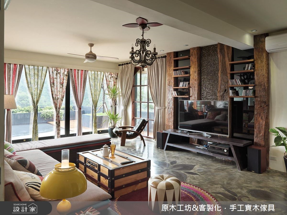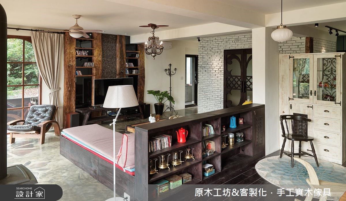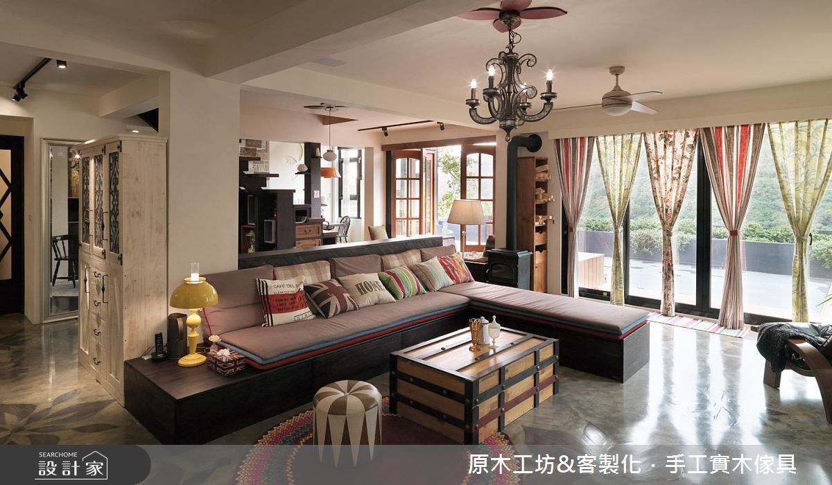 坐落在清幽的山林裡,走過30年、宛如廢墟的老房子,在李佳鈺設計師的巧手下,重新施作基礎工程、隔局打掉重練,且擷取大量的原木材質,加強採光、引入綠意,讓室內外情景相互呼應,打造具療癒感的鄉村風退休宅,讓我們走進來感受這股放鬆氣息! 玄關地坪以原木染色拼接而成,繽紛的視覺挹注異國風尚,且成功界定內外領域。整體公領域以開放隔局為設定,地坪以原木雕刻的花朵造型嵌入水泥裡,感受自然美意。而為了提高室內明亮度,以原木架高的和室空間特別拆除牆體,並以玻璃折門來調節空氣與光線的流通,引入充沛的自然光與山林景緻,強化與室內的連結;餐廳區為挑高空間,利用不同石材拼接出長條型的造型牆,視覺隨之向上延伸,一旁的白牆則是局部鑿卸磚牆,以花朵造型予以點綴,營造低調的美學丰采;而透過玻璃打造空中步道的手法,通透的材質讓光線更暢阻無礙,感受寬敞之意,同時也達到易清潔的實用功效。 小編的最愛 將樓梯的開口重新安排,從戶外調整至室內,且利用低矮階梯形塑的畸零空間,梯面兩側轉化為收納機能;低矮的沙發背牆為開放展示櫃,也是家屋裡重要的收納設計。