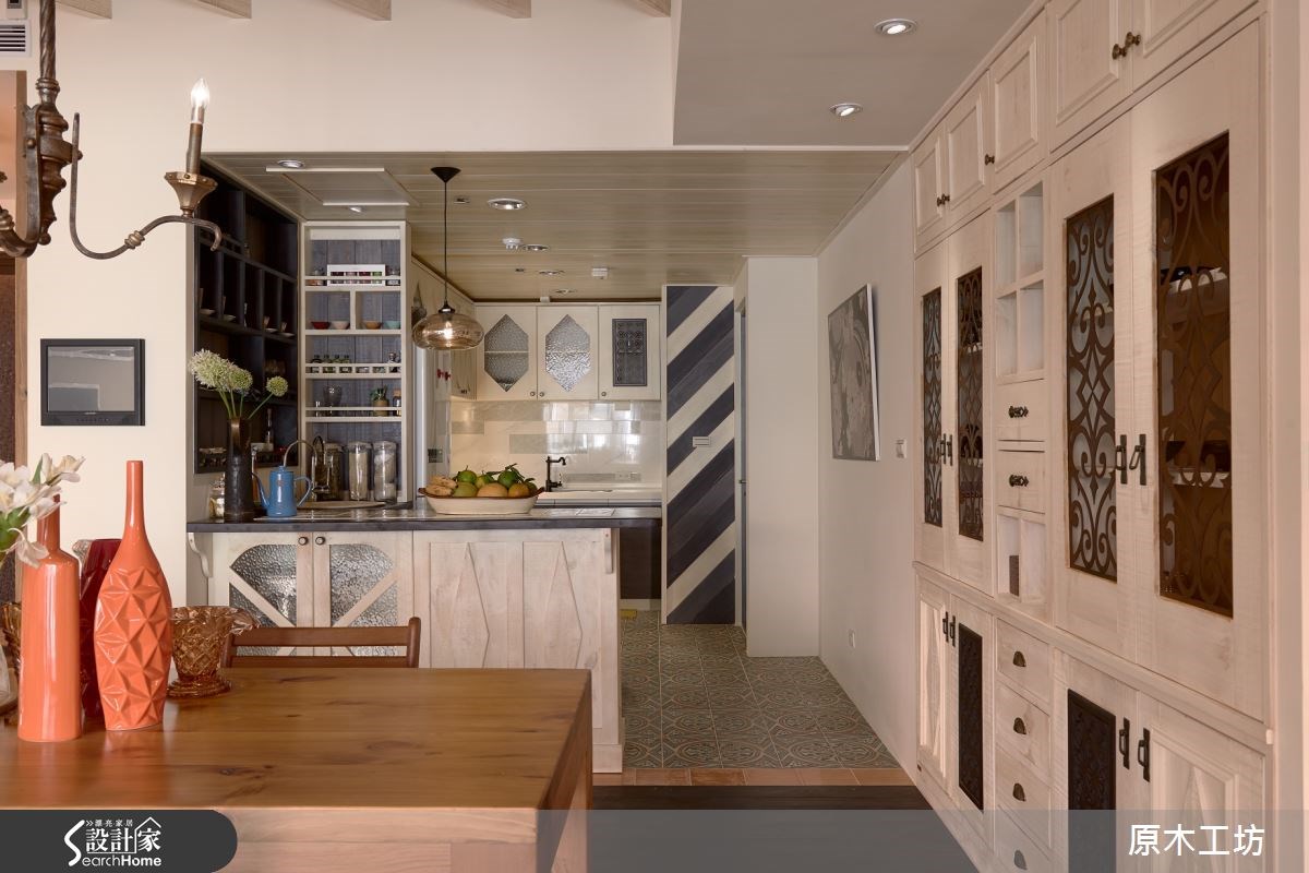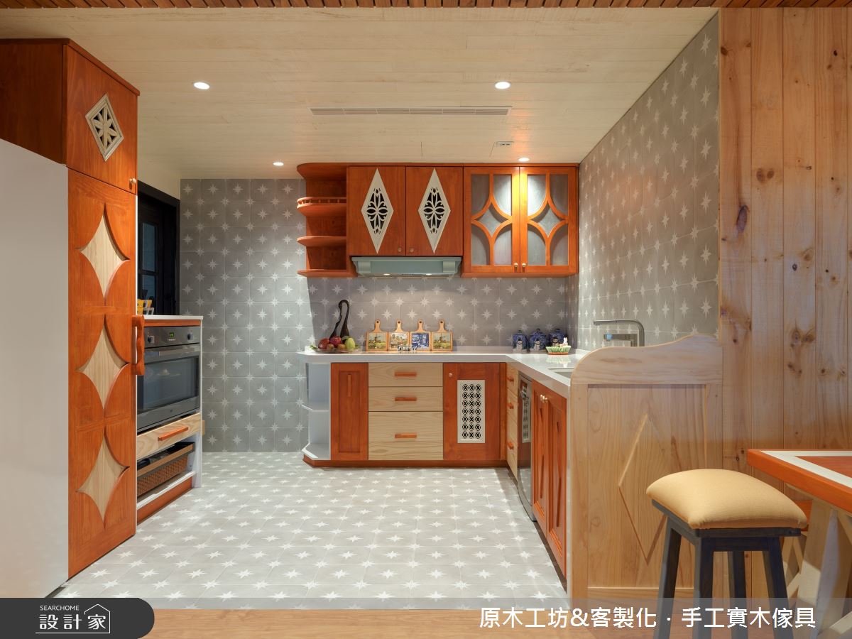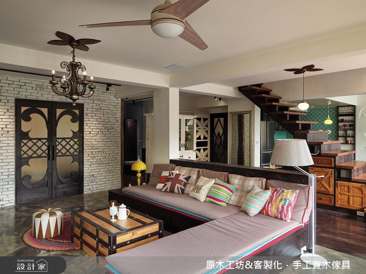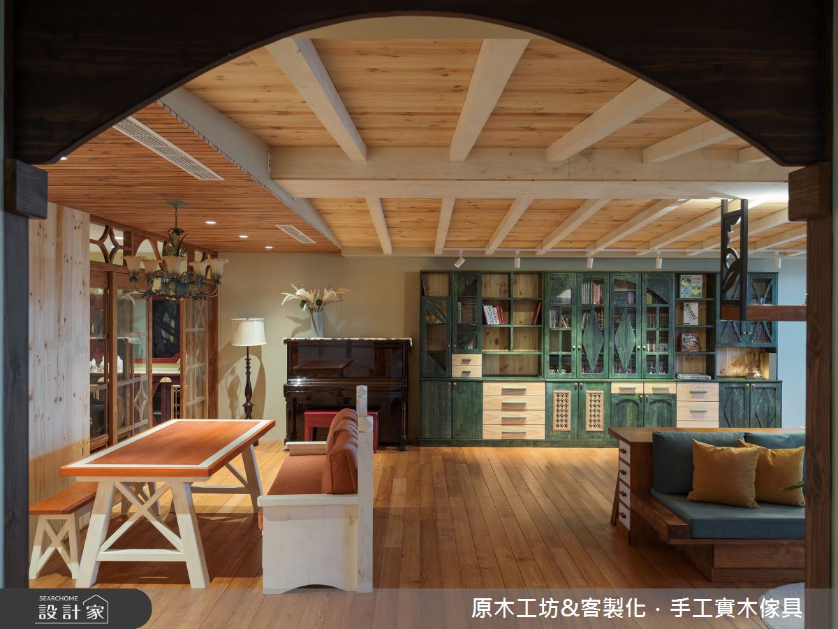 由原木工坊&客製木傢具精心規劃的60坪三房住宅空間,家庭成員一共有2位大人、2位長輩。因應屋主需求,設計師運用混搭風作為主軸,搭配油漆、六角磚/蜂巢磚、花磚、木地板、磁磚、石材、原木、窗花,打造全家人的夢想家居。