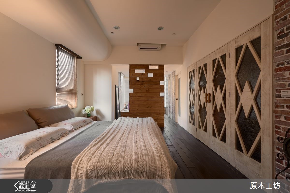 此案是屋主第二次與設計師合作,從毛胚屋開始便進行設計規劃,僅利用原木質感打造造型收納與門片的方式,巧妙界定出領域,形塑通透的空間氣息;透過大量的原木材質,也調和出動人、溫馨的家屋氛圍。 原木勾勒的植物造型,染上內斂色彩後,嵌入水泥地坪,轉化為玄關地坪,與深紅色的鏤空植物造型相互呼應,交織出藝術感的迎賓味道。由於屋主愛泡茶,客廳的臨窗位子利用架高木地板,創造出可愜意泡茶、泡咖啡的休閒場域;電視牆以簡約的壁面襯底,於大樑下的交界處做了雙色變化,嵌入木作層板後,陳列屋主收藏的物件與書籍,營造出親切、貼和人心的生活感;沙發後方以造型牆面圍塑和室區,為靜心寫書法的禪意空間;餐廳的天花板以斜木樑為設計,消弭大樑體積,而整片以深色實木地板為主,餐桌下方特別以菱形花磚鋪設,烘托視覺新穎質感;米色調餐櫃的擺設則界定出餐廳與小孩房,擁有收納機能且達到領域劃分,更享有搬遷拆除的彈性。 小編的最愛 主臥室裡,藉由長短不一的厚實木料堆疊出局部牆面,成功界定臥室與衛浴空間;絕佳的採光透過鏤空方格走入睡眠區,提昇亮度,也可擺設一些植栽或物件,妝點空間氣息。