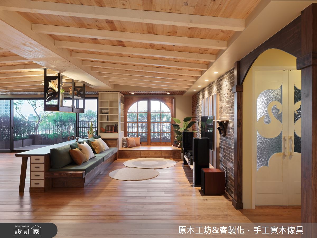 位於新北市一間 60 坪,原本只有前後採光的長型老屋,屋主曾經在換屋與翻修之間猶豫不決,在設計師的巧妙規劃下,將此居宅打造成為明亮通透的自然原木感寬敞空間,一起來看看設計師如何辦到的吧! 打開大門之後,可以看見的是明亮又自然的居家景色,客廳的電視牆兩側以實木刻花為底,並利用橘色、綠色染色,讓視覺感到鮮豔明亮之外,隨著大面開窗引入光線,充滿朝氣清爽的氛圍便不言而喻。同時設計師以整面的松木實木書櫃為隔牆,創造出足夠的收納機能;上方鏤空的窗花設計,則讓光線、空氣自由穿透,創造自在舒適的氣息。 隨著生活動線走入了餐廳的場域,在將原有的隔間牆面拆除後,封閉的餐廚空間變成開放式設計,讓家人或來訪親友擁有足夠的互動聊天空間。搭配著樸實沈穩的實木廚具與刷白的文化石磚牆,用餐時光更添人情味。主臥室的一側面向戶外露台,藉由大片落地窗與實木臥榻,那綠意入室,進而鋪陳出休閒度假的氛圍,讓身心放鬆。 小編的最愛 在此案例當中,設計師以實木、復古磚與磚牆等質樸的建材,讓家充滿放鬆紓壓的感受;回到家就如同度假一般,什麼煩惱都拋到腦後。