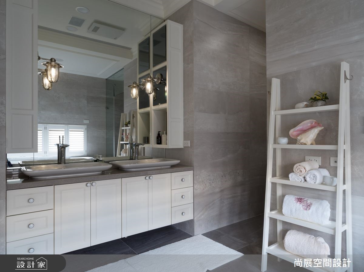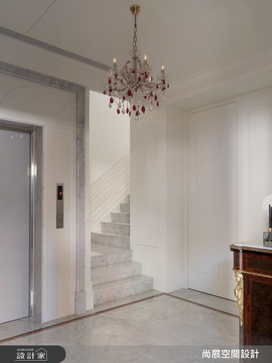 由尚展設計精心規劃的135坪四房住宅空間,家庭成員一共有2位大人、1位小孩。因應屋主需求,設計師運用新古典作為主軸,搭配壁紙、超耐磨木地板、鐵件、磁磚、線板、木作、玻璃,打造全家人的夢想家居。